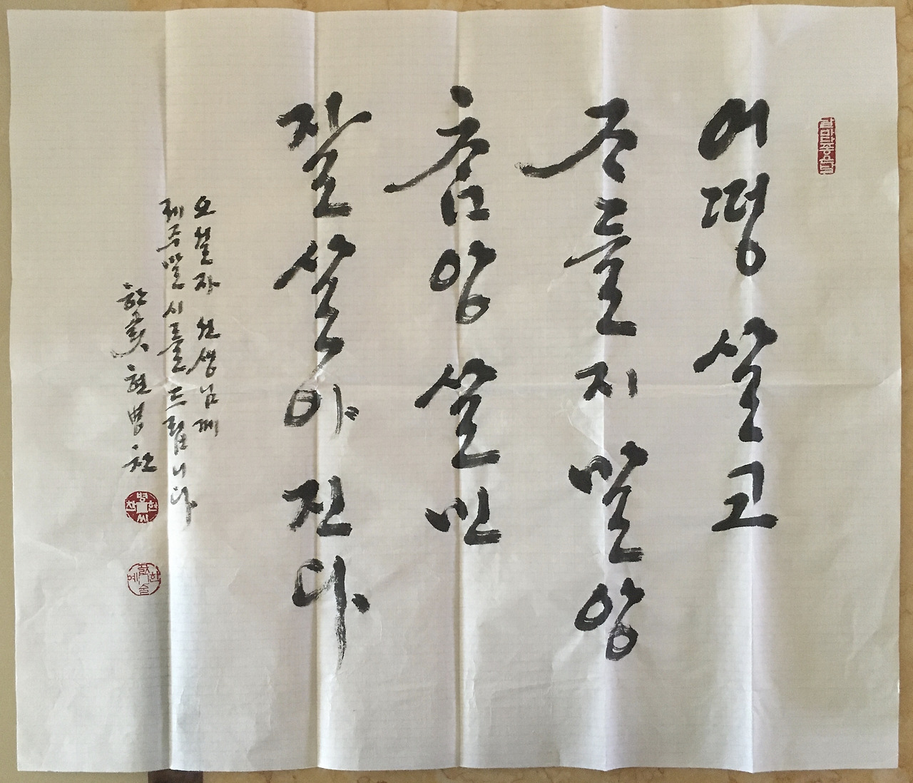 며칠 후, 제주 예술인마을 소인이 찍힌 커다란 봉투 하나 등기로 왔습니다. 뜯어보니 붓글씨로 쓴 화선지가 들어 있었습니다. 조심조심 그것을 펼쳤지요. 나는 소리를 지르고 말았습니다. 아름다운 제주어 시 한 편을 적어보내주셨습니다.