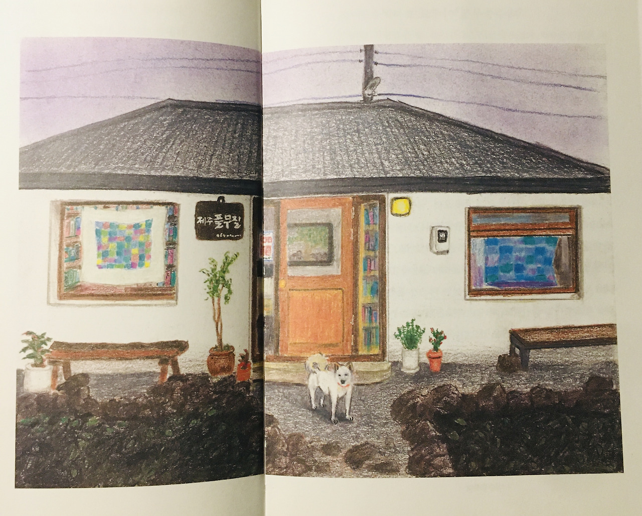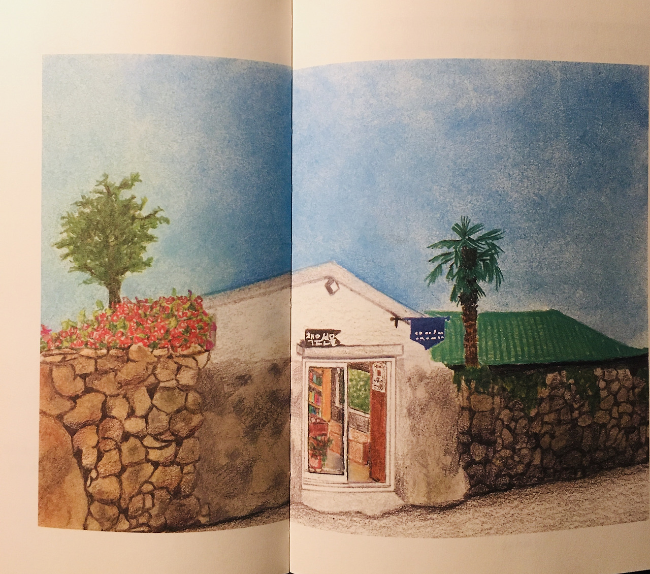 '그림책방카페 노란 우산' 책방이 눈에 띈다. 우리 고향집과 멀지 않은 곳에 있는 것을 보고 눈이 커진다. 파란 슬레이트 지붕의 건물 두 채에 한쪽은 카페를 하고 한쪽은 책방을 한다. 그곳은 그림책을 주로 취급한다. 고향집과 가까운 곳에 있으니 다음에 가면 들러보고 싶다. 제주에 있는 책방 한 군데씩 다녀볼까 하는 마음이 모락모락 일어난다.