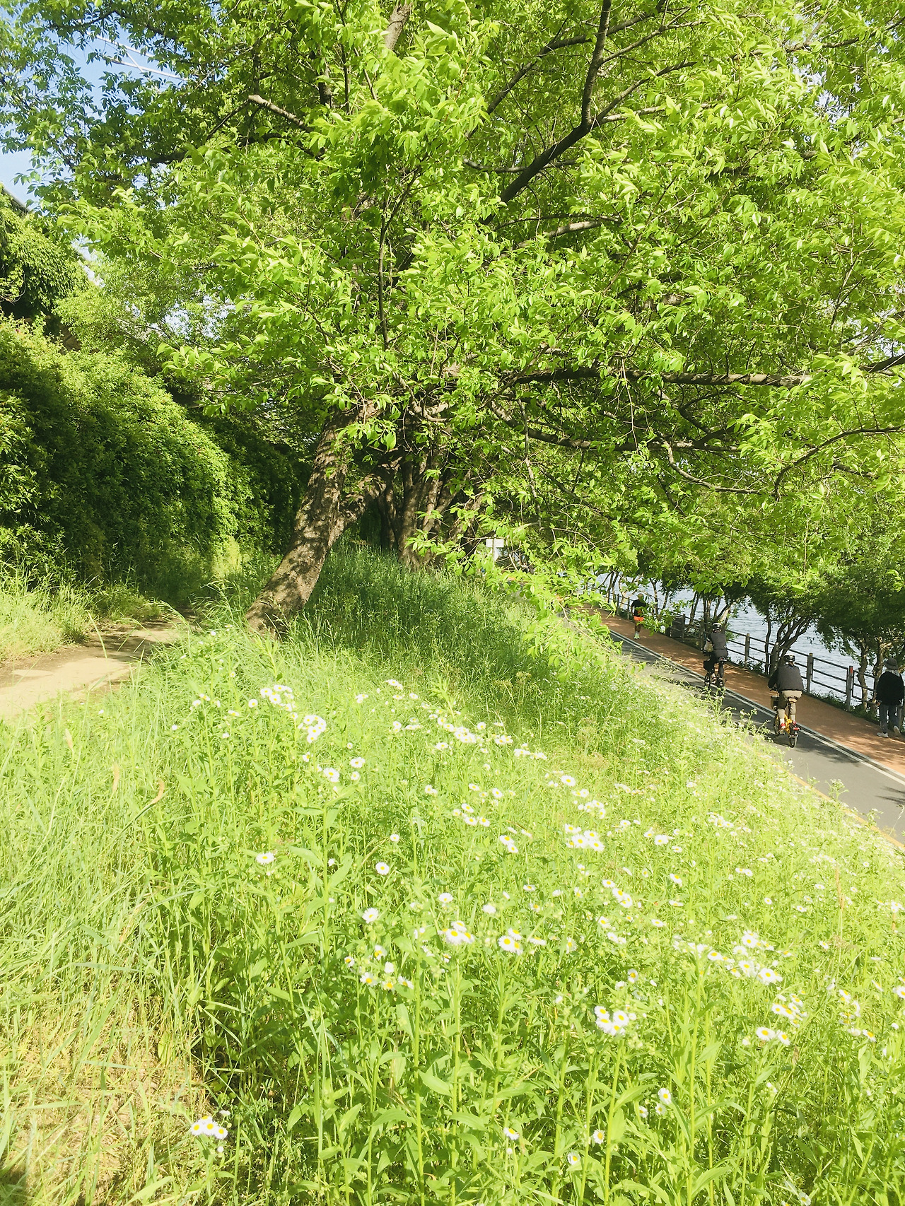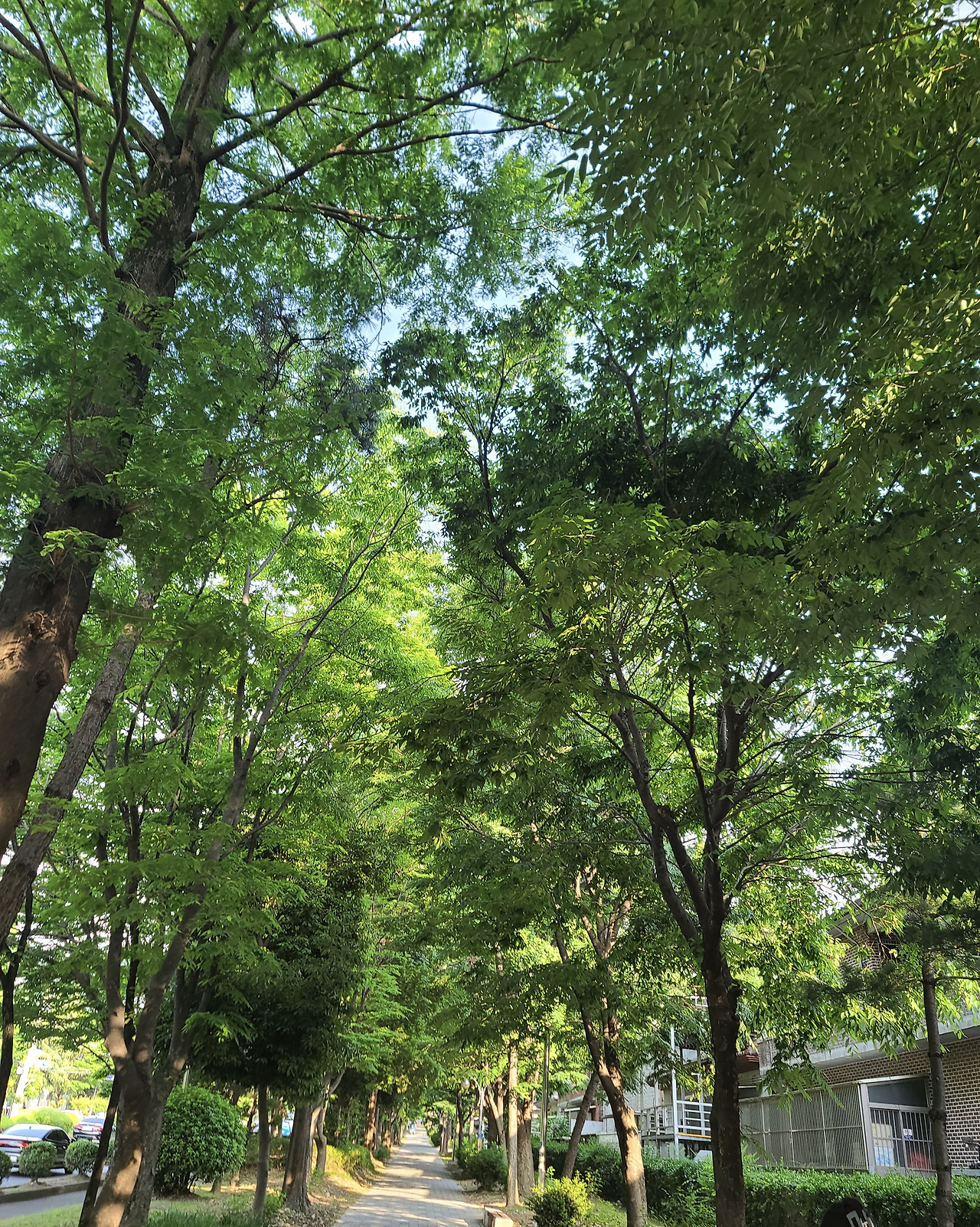 나무들 아래 자라는 작은 풀들, 포슬한 검은흙이 품은 지렁이와 작은 개미들, 포르륵 포르륵 날아다니는 참새들, 그 사이로 빛나는 햇살. 싱그런 마음들이 나무에 걸려 있다. 나무 아래를 걸으면 푸른 물이 내 어깨에 내려앉는다. 내 안의 구겨진 마음들이 반듯하게 펴지지 않을 수 없다. 그게 다 나무의 덕이다.