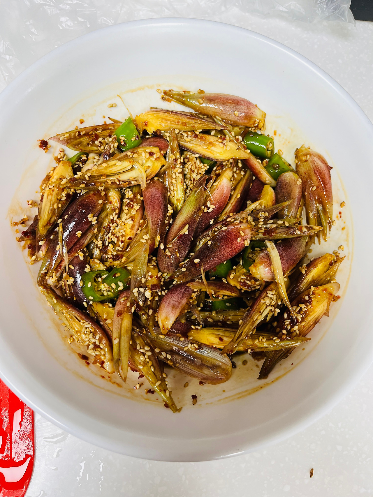 우영팟 담벼락 아래 양애를 뽑아 만든 양애반찬. 오빠가 보내온 사진