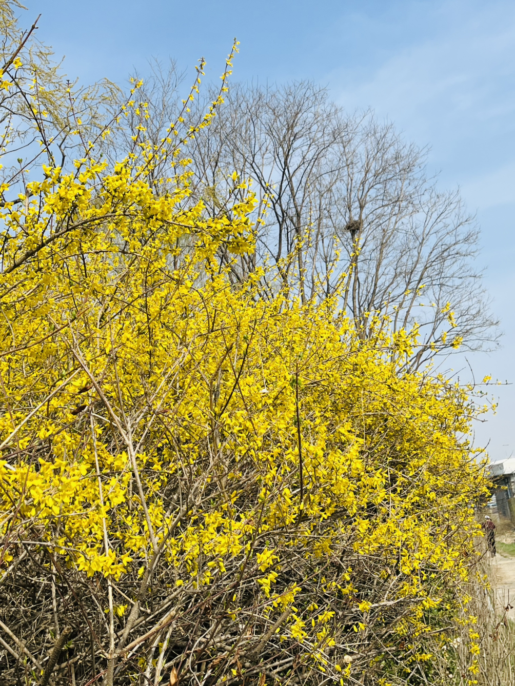 산수유나무들이 무리 지어 있는 길.