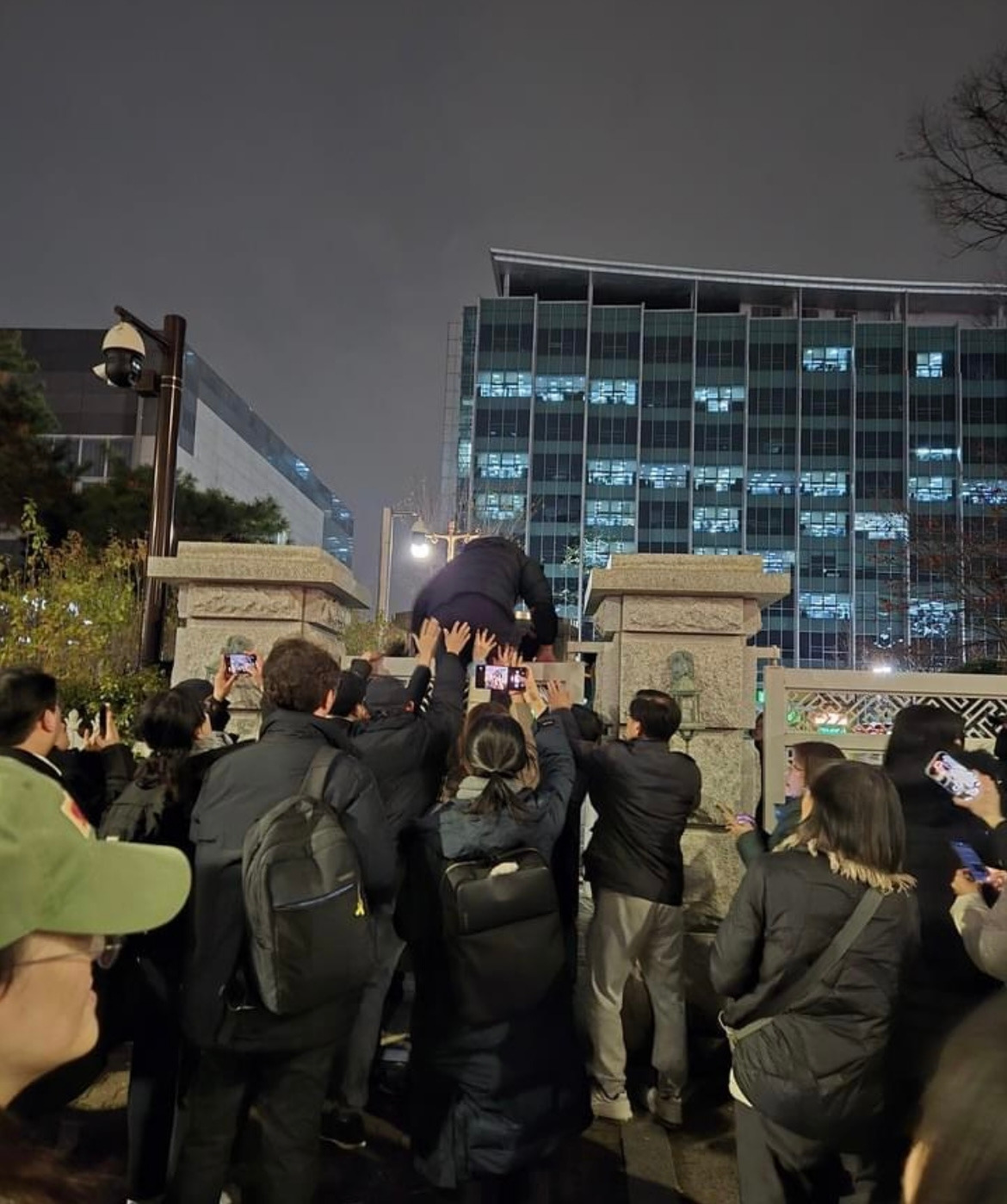 빨리 국회에 들어가라며 의원을 담장 너머로 밀어주는 시민들. 한밤중에 난리도 이런 난리가 있었을까 싶다. 안동 지인들로 이루어진 몇몇 단톡방에서는 ‘윤석열 화이팅’을 외치는 분들도 계셨는데, 아무리 나의 고향이라지만 삐뚫어진 지역분들의 모습에 이젠 환멸을 느끼게 된다.