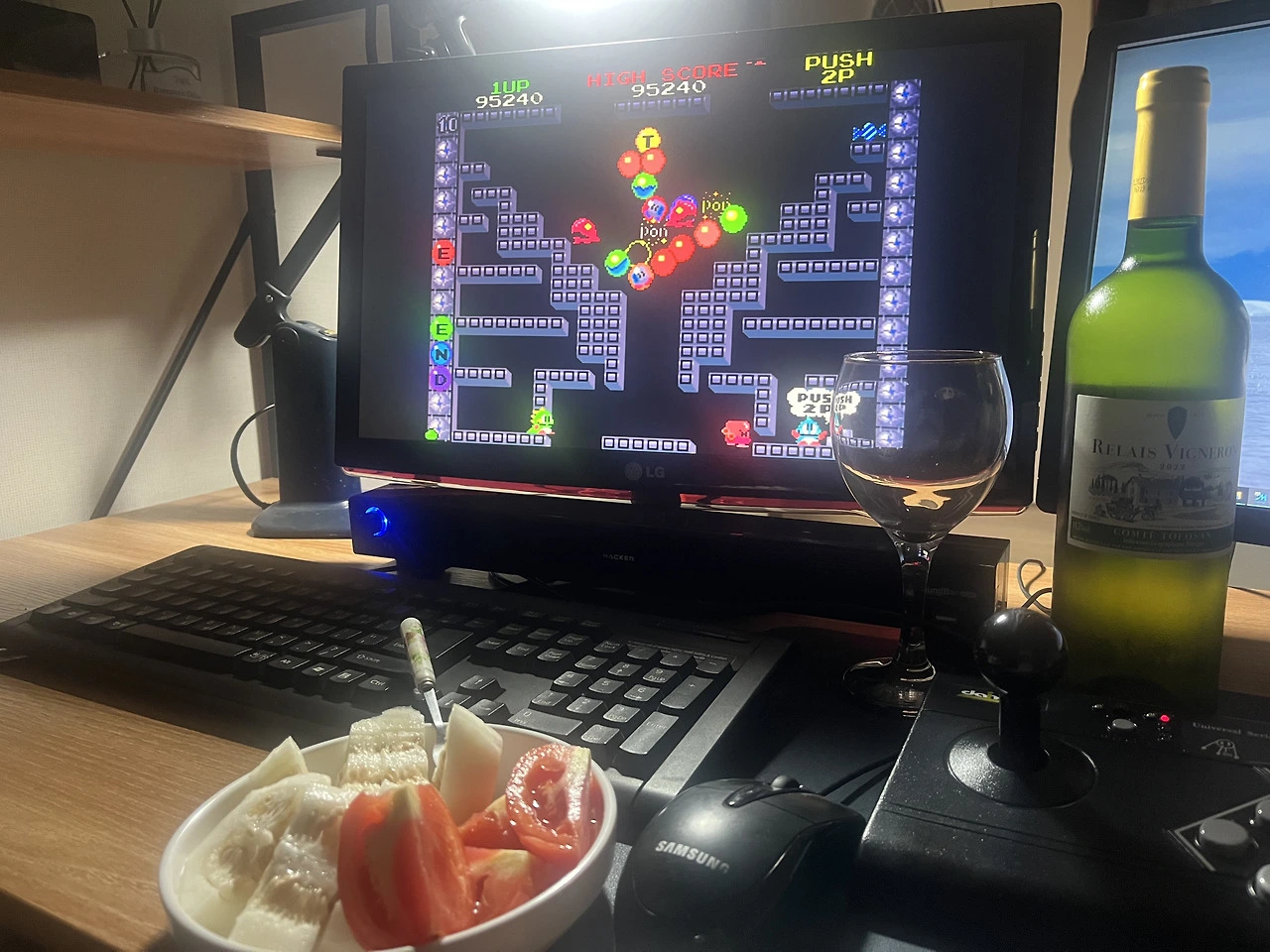곁에는 선물 받은 화이트 와인과 참외, 토마토를 준비해 두고 나는 하염없이 게임 속으로 빠져들었다. 보글보글은 주인공 공룡 캐릭터와 빌런들도 귀엽지만, 배경음악을 빼놓을 수가 없다. 한 소절만 들어도 온 국민이 다 알고 있는, 바로 그것이다. 시간이 지체되면 흰고래가 등장하는데 그에 따른 배경음악 역시 우리는 익히 잘 알고 있다. 오늘은 60판즈음 갔을까, 보너스로 얻은 목숨 갯수도 다 까먹은터라 거기서 끝이 났다. 시간은 1시간 정도가 흐른것 같고, 와인은 반병이 남았다.