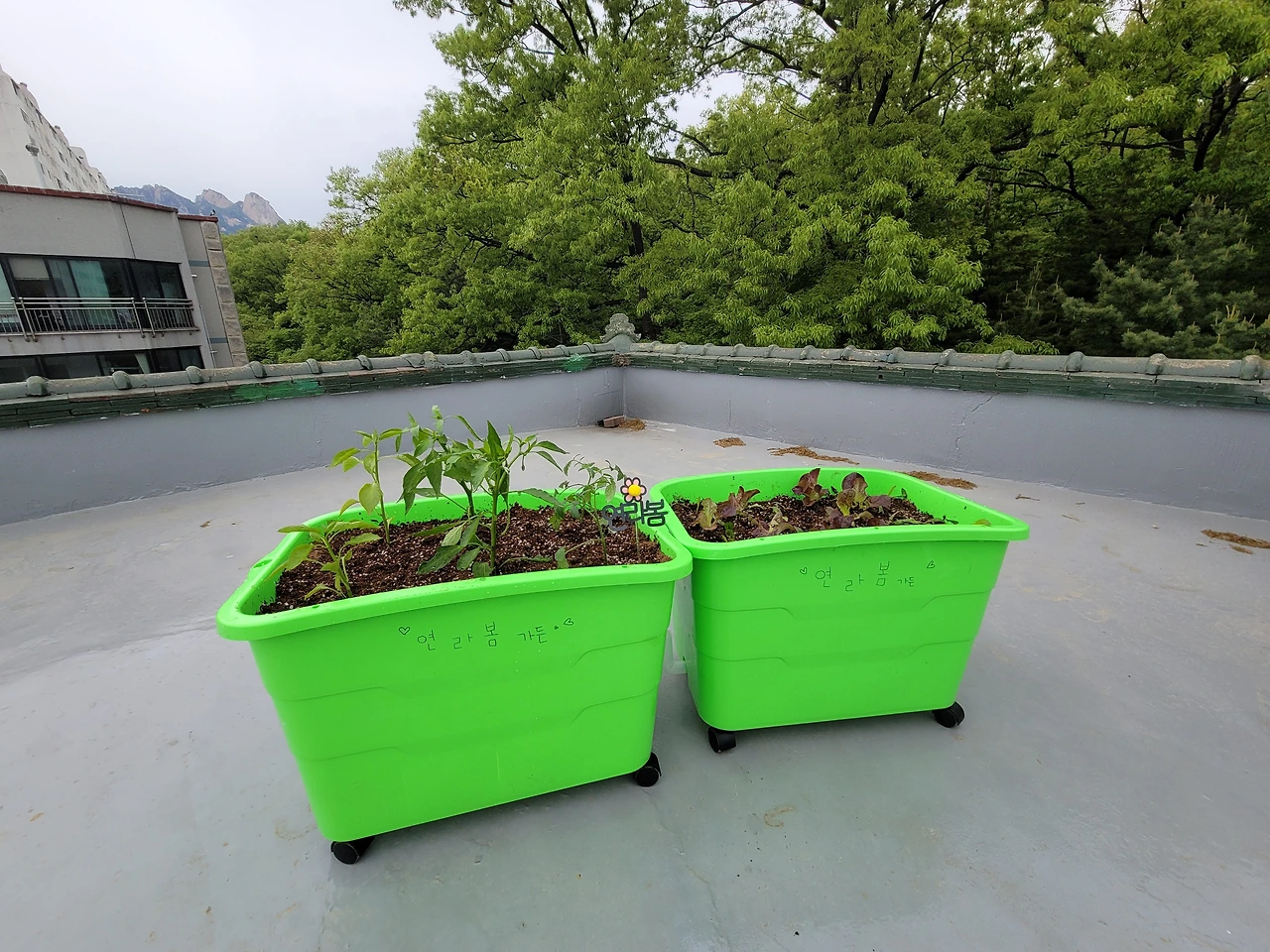 엄마의 진두지휘 아래, 커다란 비닐과 들통이