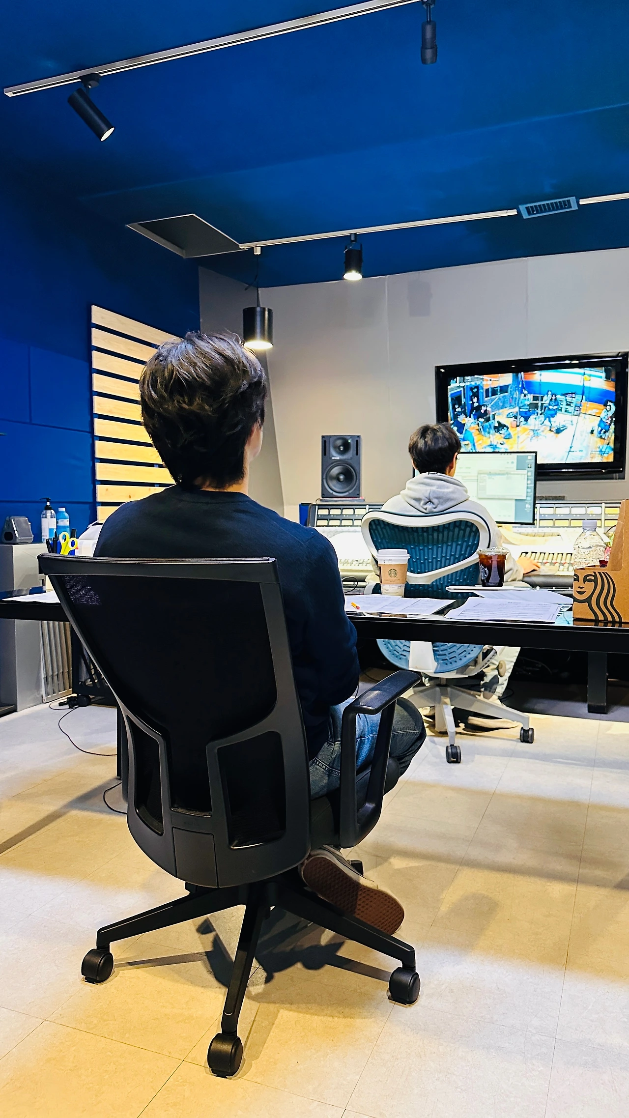 앞 순서의 녹음이 20분 가까이 지체됐다. 연주자들이 쉬는 시간도 필요했기 때문에 예정 시간보다 30분 늦게 시작할 수 있었다. 녹음실에서는 녹음 부스 안의 연주자들과 토크백으로 의사소통을 하기 때문에 녹음을 하는 동안에는 묘한 긴장감이 흐른다. 우선 녹음을 시작하면 연주자들은 예민해지기 마련이고 녹음과 잠시 멈춤 사이에 디렉터와 악장은 서로의 의견을 빠르고 정확하게 전달하고 반영해야 하기 때문이다. 한껏 집중하는 데서 오는 팽팽한 긴장감이 스튜디오에 가득했다. 빡빡한 녹음 일정에 쫓기는 시간이 긴장감을 더했다. 남편은 대형 스피커로 흘러나오는 선율에 온몸을 맡기며 디렉팅에 집중했고 나는 뒷자리에서 핸드폰을 들고 조용히 촬영했다. 남는 건 사진과 영상뿐이지 않던가. 어느 부분이 어떻게 필요한지 모르니 나는 팔이 저리도록 한 시간 가까이 핸드폰을 들고 있었다. 우리는 서로의 역할에 최선을 다했다.