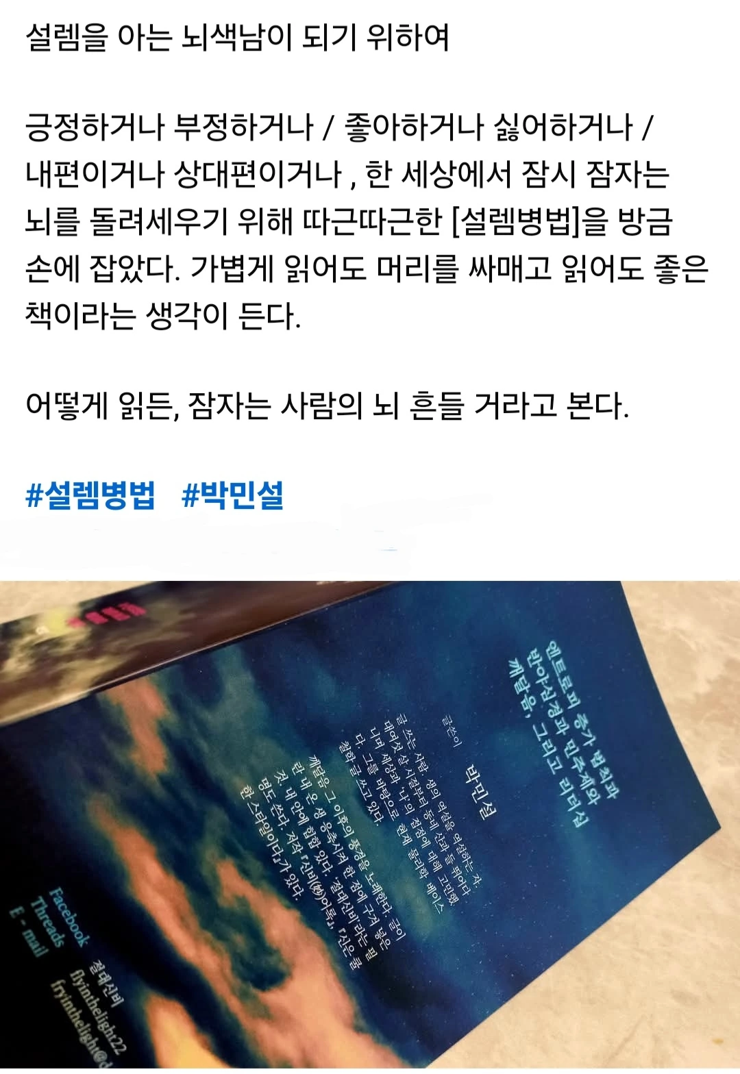 곧 방방곡곡 전국 서점에 깔리겠지만 난 저자 싸인본에 홀려서 미리 주문했다. 마지막 장을 덮고 나서야 난 저자 박민설이 철학을 빙자하여 서사시를 썼다는 걸 알아차렸다.