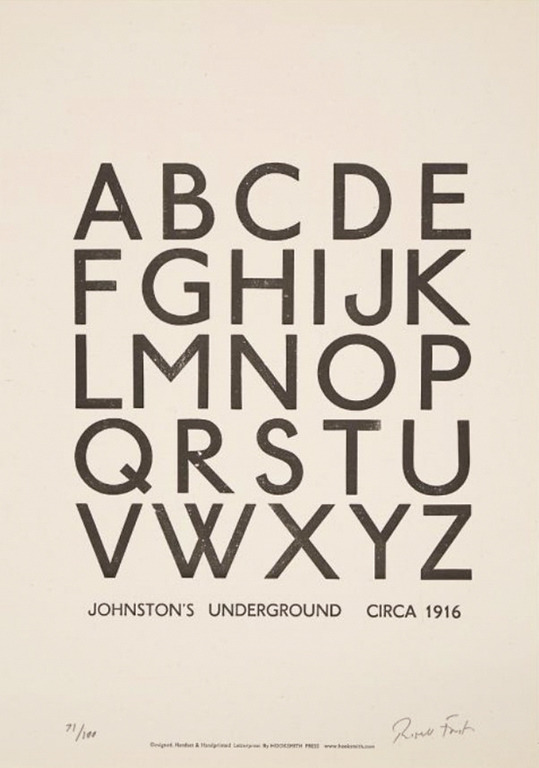 존스턴은 인쇄소에 대문자 E를 인쇄하는 방법까지 상세하게 설명할 정도로 섬세한 디자이너였습니다. 그의 서체는 단 하나의 굵기로 시작되었으며, 이후 볼드체가 추가되었지만 그는 이를 승인하지 않았습니다. 그는 이 서체를 ‘지하철 철도용 블록 문자 Underground Railway Block Letter’라 불렀고, 완성된 활자디자인 그 자체보다는 공공의 목적을 위한 도구로 여겼습니다. 이후 이 서체는 사이니지 작업자들을 위한 지침서로 배포되었으며, 목활자와 금속활자로 제작되어 런던 전역의 포스터, 안내판, 광고 등에 사용되었습니다.