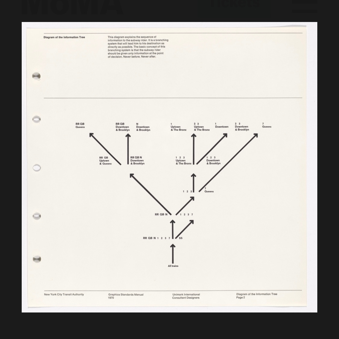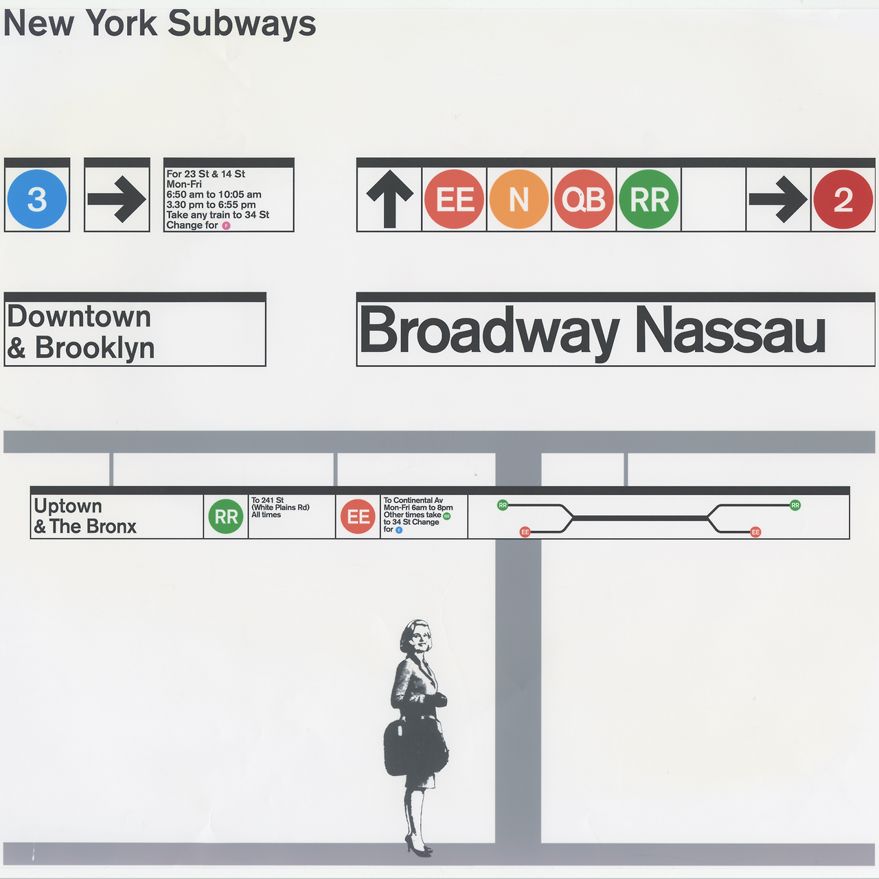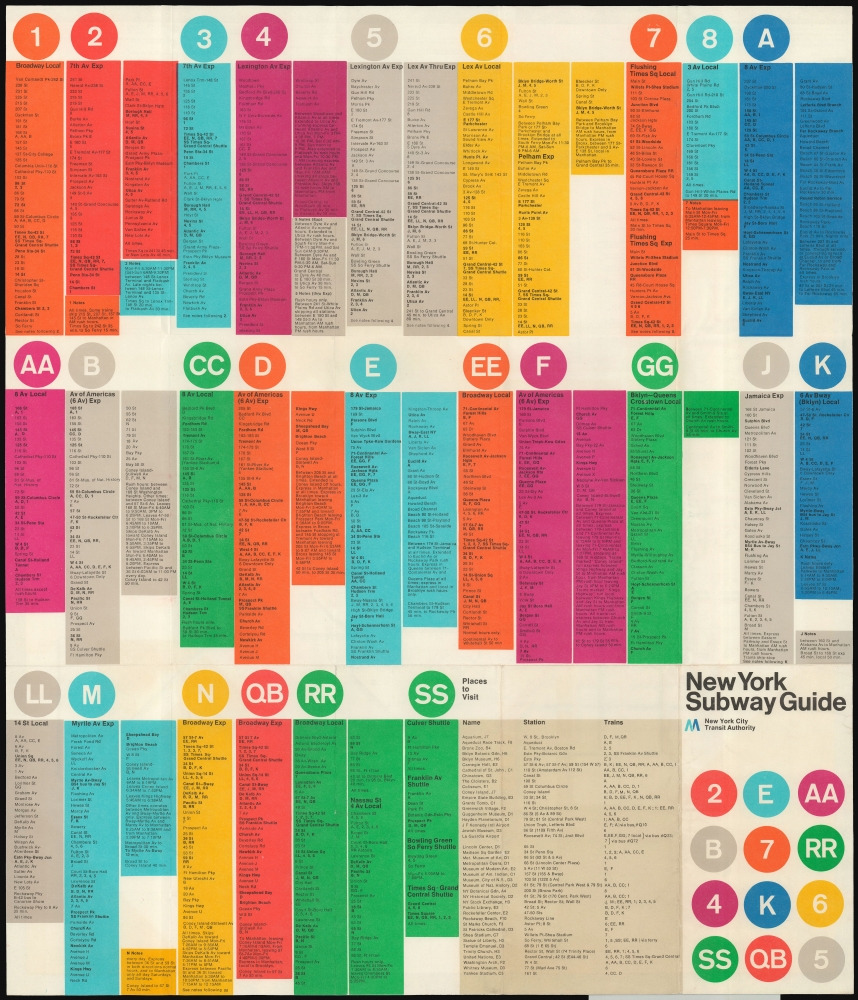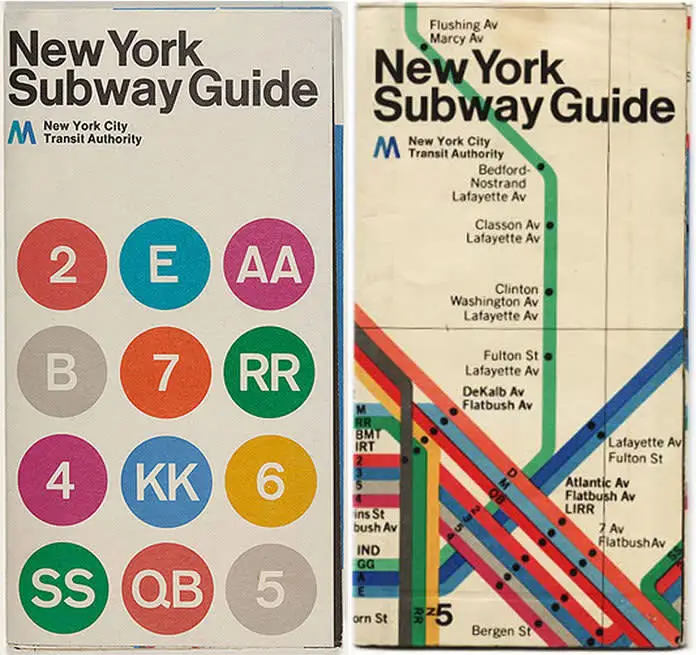 1960년대 중반까지 뉴욕 지하철의 시각 환경은 극심한 혼란 상태였다. 서로 다른 운영회사 시절에 만들어진 표지판들이 뒤섞여 일관성이 없었고, 안내 스타일도 겹치고 모순되어 이용자 경험은 엉망이었다. 뉴욕 도시교통청 New York Transit Authority은 이 문제를 해결하기 위해 1966년 그래픽 디자이너 마시모 비넬리 Massimo Vignelli와 그의 동료 밥 누어다 Bob Noorda를 영입하여 지하철 안내체계의 전면적인 시각 디자인 개편을 추진했다. 두 사람이 이끄는 유니마크 Unimark International는 방대한 지하철 시스템의 표지 및 노선 지도를 현대적으로 통합하는 과업을 맡았다. 그 결과 1970년 뉴욕시 교통청 그래픽 표준 매뉴얼 Graphics Standards Manual이 출판되고, 1972년에는 새로운 지하철 노선도가 도입되는 등 지하철 디자인에 통일성과 질서가 자리 잡게 되었다.