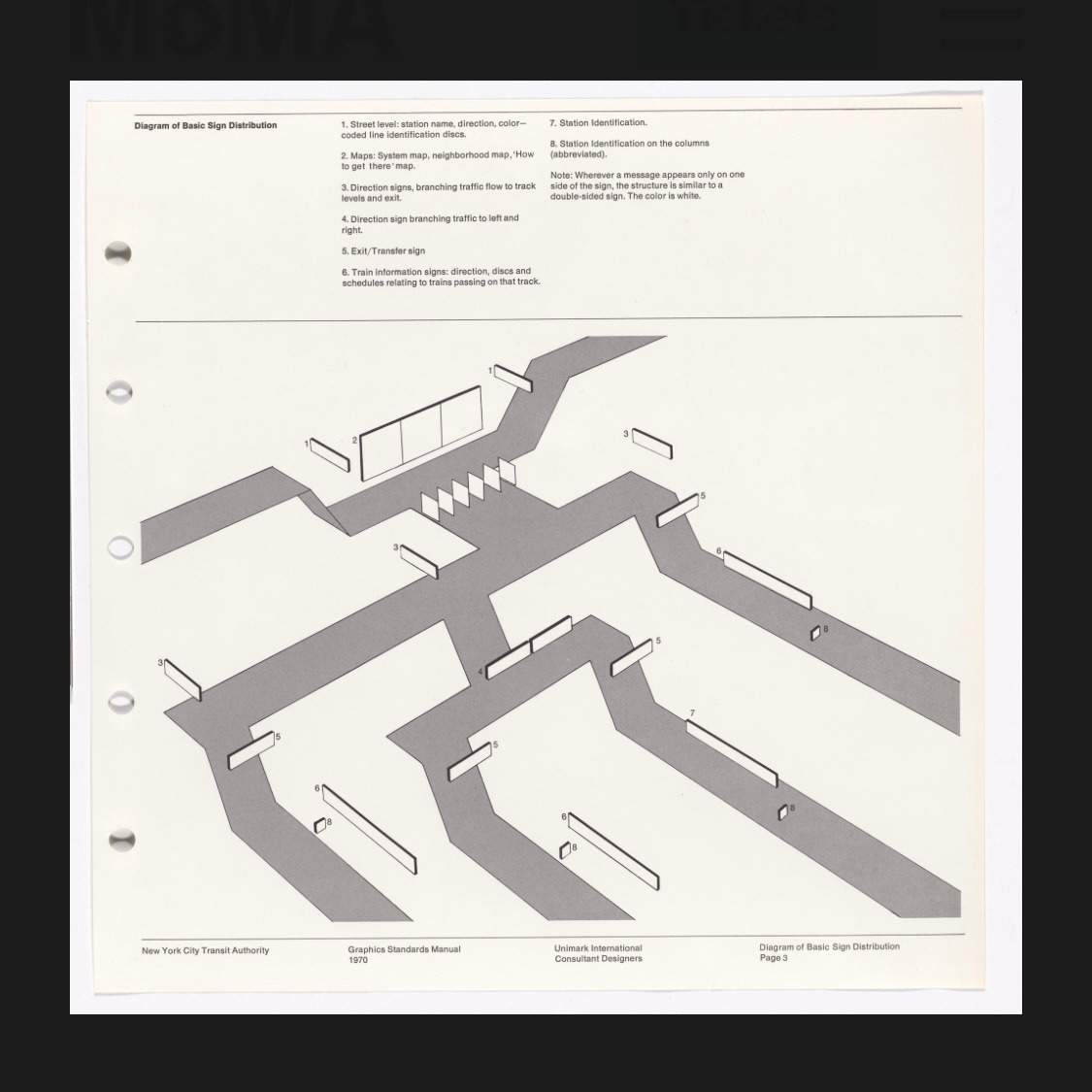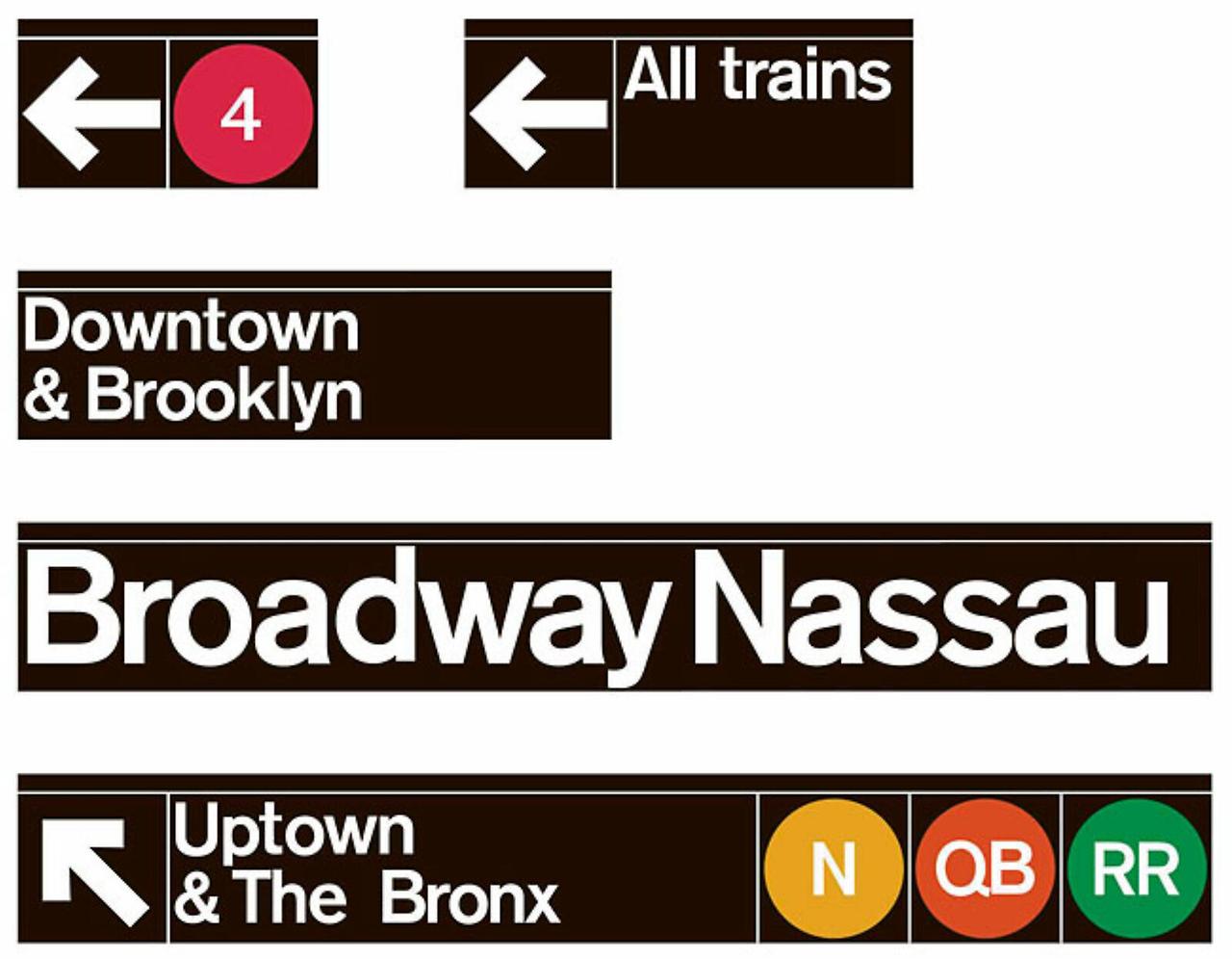유니마크 팀이 설계한 뉴욕 지하철 역명 표지판의 예시. 모든 역명은 동일한 무산세리프 글꼴(헬베티카)로 표기되고, 노선 표기에는 색상이 입혀진 원형 기호가 사용되었다. 이러한 일관된 디자인 요소 덕분에 어느 역을 가더라도 익숙한 형태로 정보를 인지할 수 있게 되었다.