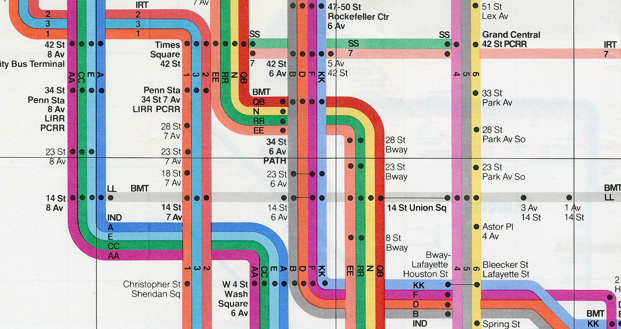 1972년 도입된 비넬리의 뉴욕 지하철 노선도는 현실 지형을 생략하고 노선과 역 정보만 담은 다이어그램 형태로 그려졌다. 비넬리는 1933년 런던 지하철 지도를 디자인한 해리 백 Harry Beck의 방식을 따라 뉴욕 지하철 수직과 수평 또는 45도 각도로 표현되었고, 역들은 일정 간격으로 배치된 점으로 표시되었다. 이러한 간결한 표기법은 복잡한 지하철망을 추상화하여 시각적으로 이해하기 쉽게 만들었다.