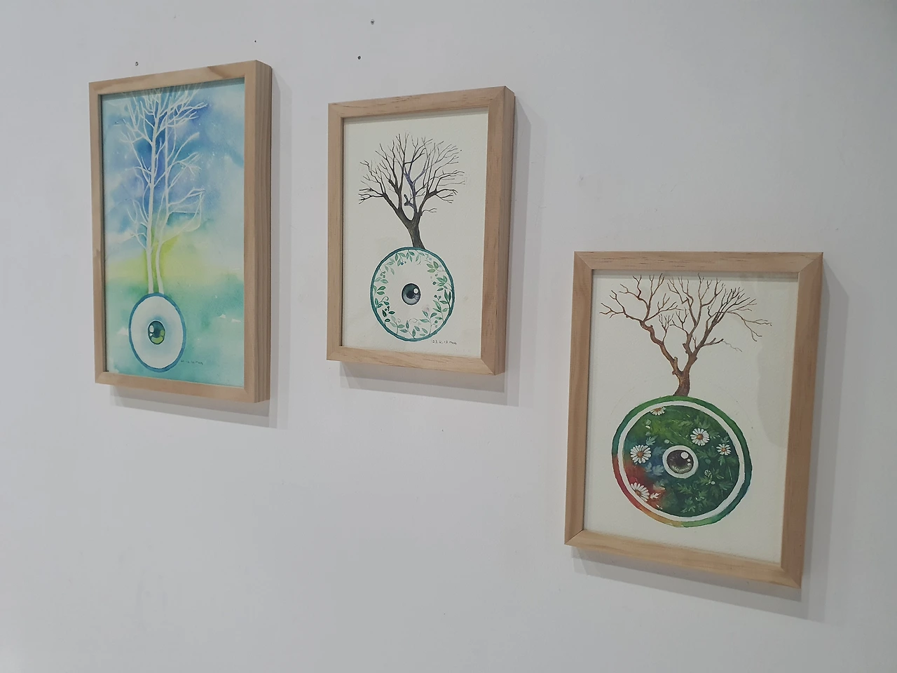 켄트지를 눈앞에 매우 가까이 놓고 그려야 하는 그녀의 그림은 작지만 아름답고 경이롭다. “반복해서 눈알과 나무라는 고정된 형상을 기계적으로 그리면서 아직도 세상 어딘가에 나의 눈이 살아 있기라도 한 것처럼 매일 ‘눈’을 기다리는 나의 마음을 보여주고 싶었다.”라고 밝히는 그녀의 시간에서 난 희열을 보았고 몰입과 즐거움을 보았다. 눈은 그녀에게 대지가 되어 그녀를 쉬게 하고 울게 하며 살아가게 한다. 식물의 뿌리를 닮은 시신경이 자라는 그곳은 그녀의 유토피아이자 화두이며 그녀 내면의 나무가 깊숙이 자라는 영토가 되어준다. 그래서 다행이다.