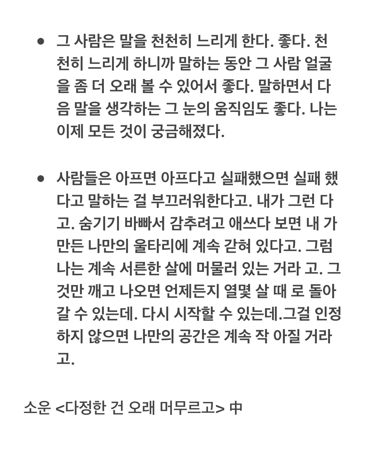 책을 읽으면 매 글마다 내 인생에 담아두려 어디엔가 기록을 남기곤 한다. 기록하는 순간의 생각이 아까워서, 짧게나마 아웃풋을 늘리고 싶어 끄적여본다.