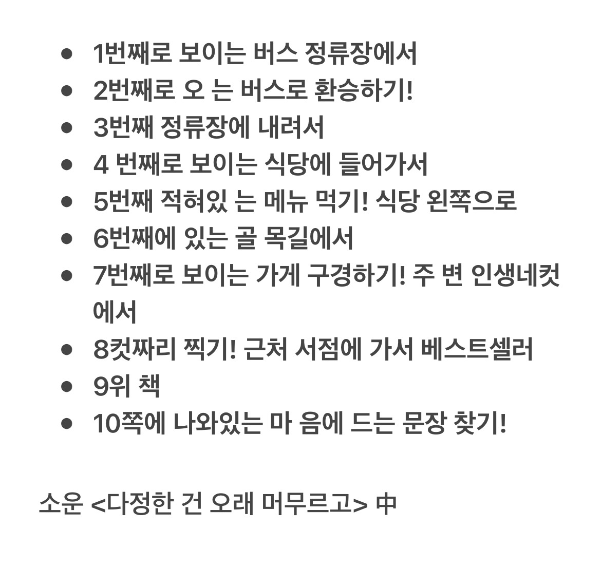 여행온 김에, 그리고 자주 하고 싶은 1-10 숫자 챌린지. 어쩜 이런 생각을 했을까 귀엽고, 매번 다른 글이 튀어나올 생각에 얼마나 재밌을지 기대가 된다.