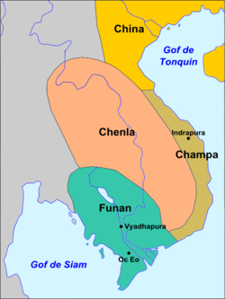그러나 5세기 무렵부터 쇠퇴하기 시작한 푸난은 결국 첸라(Chenla/Zhenla/ចេនឡា) 왕국에 의해 멸망했다. 첸라는 푸난 왕국 시절 도시국가 중 하나로 시작해, 7세기에 푸난을 병합하고 독립왕국으로 성장했다. 첸라왕국은 메콩강 중앙 유역에서 시작되었으며, 푸난 왕국을 계승해 도시국가의 연맹 형태로 발전했다. 하지만 자야바르만 1세(Jayavarman I, ជ័យវរ្ម័នទី១) 사후 내륙 첸라(육진랍)와 해안 첸라(수진랍)으로 분열되었고, 해안 첸라는 인도네시아 자바섬의 마타람 왕국에 복속되는 수모를 겪었다. 이후 마타람의 속국이 된 해안 첸라의 왕으로 세워진 자야바르만 2세(Jayavarman II, ជ័យវរ្ម័នទី២)는 세력을 키워 802년 분열된 첸라 왕국을 통일하며 크메르(앙코르) 왕국의 건국을 선포했다.