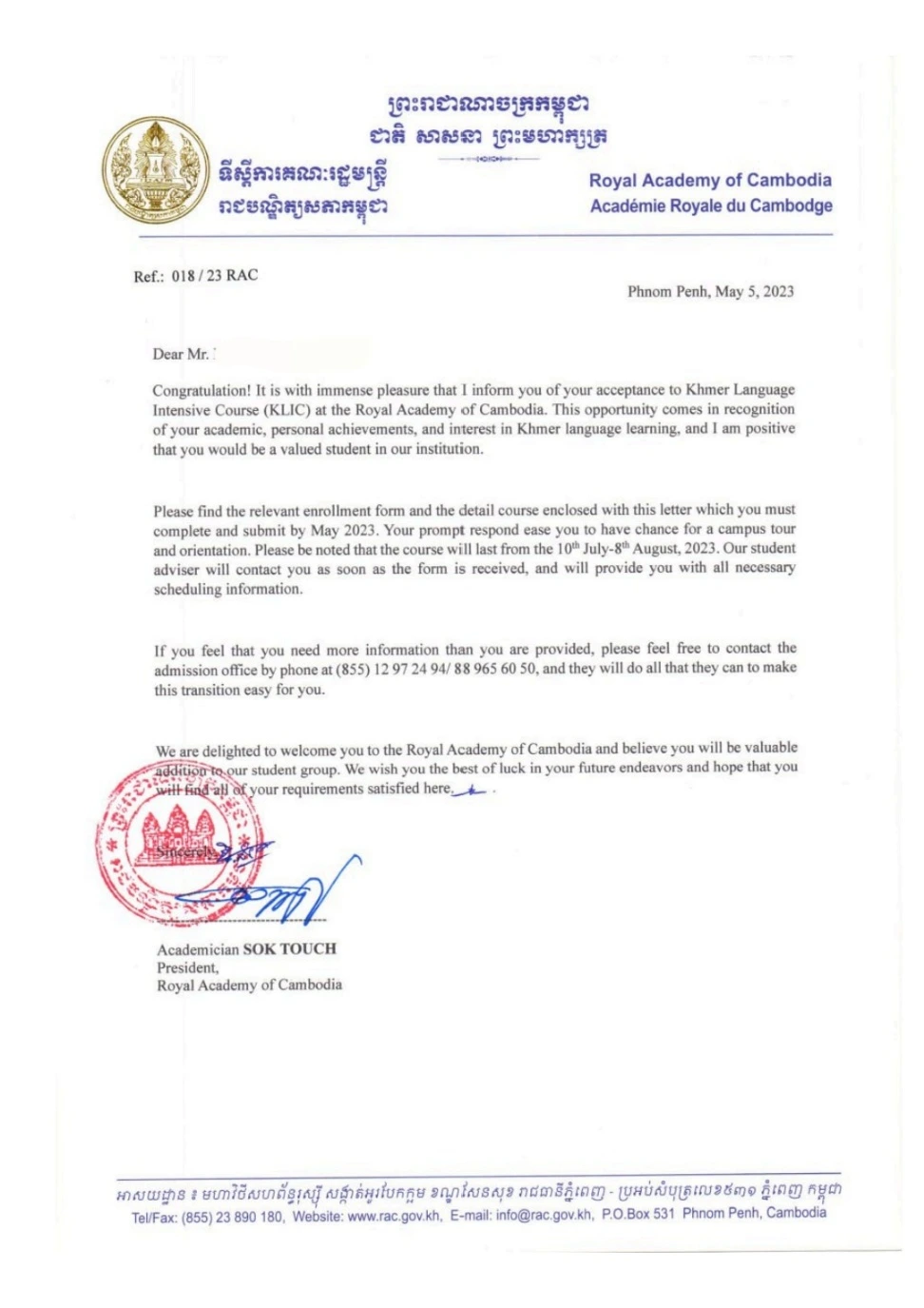 그렇게 캄보디아에 유학을 결심하고 본격적인 준비를 시작하였다. 유학을 가기 위해서는 제일 먼저 캄보디아 프놈펜에 있는 캄보디아 왕립학술원의 입학 허가서가 필요했다. 입학 허가서를 받기 위해 교수님을 통해서 먼저 학술원에 단기연수 신청을 하였고, 허가가 떨어지기를 기다리면서 다른 준비를 하기로 했다.