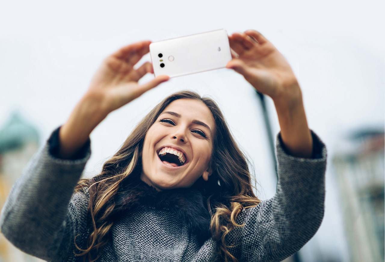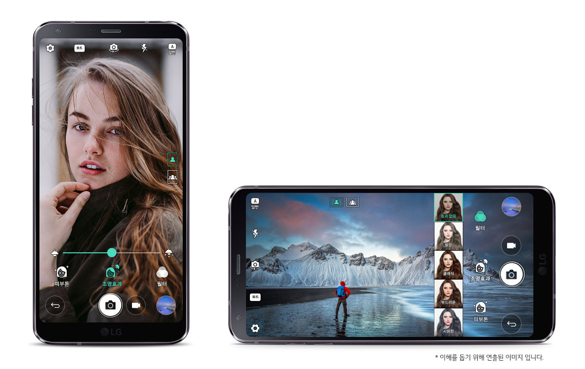 G6는 셀카족들을 위해 전면 카메라 광각 또한 지원합니다. 전면 카메라는 100도 광각을 지원하여 셀카 촬영 시 편리하게 사용할 수 있고요. 뿐만 아니라 피부 톤 및 조명효과, 다양한 필터효과까지 사용할 수 있습니다.