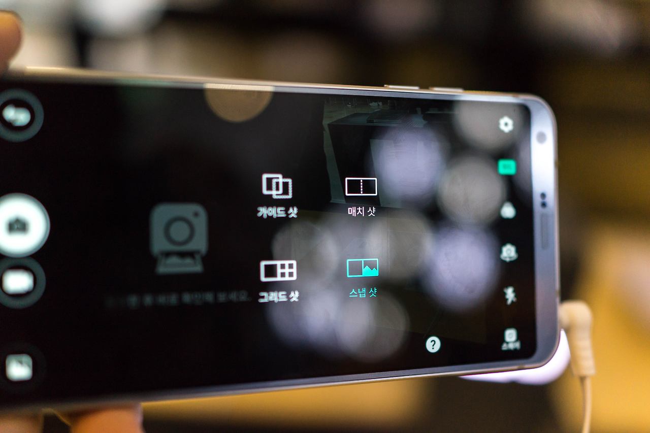 G6에는 18 : 9 화면비의 풀비전 디스플레이를 극대화하여 스퀘어 카메라 UI를 탑재하였는데요. 이를 통해 SNS에서 많이 사용되는 1 : 1 비율로 사진을 촬영하고 아래쪽 화면에서 바로 확인 및 편집, 업로드까지 가능했졌습니다. 스퀘어 카메라에서는 매치샷, 스냅샷, 가이드 샷, 그리드샷이라고 하여 1 : 1 비율 사진에서도 다양한 배열로 재미있는 합성 사진도 만들 수 있었습니다.