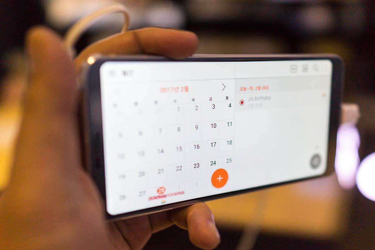 다양하게 사용해 보지는 못했지만 캘린더 앱과, 음악 앱을 보면 가로모드에서 18 : 9 비율의 디스플레이를 절반으로 쪼개 활용하는 UX를 볼 수 있었는데요. 캘린더앱을 가로 모드로 놓고 사용하니 왼쪽은 달력 오른쪽은 일정을 바로 확인할 수 있네요.