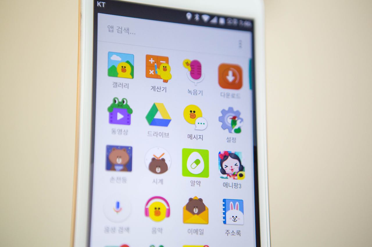 스펙도 일반적이고 특별한 장점이 없어 보일 수 있지만 라인프렌즈폰은 제품 안에 녹아든 캐릭터 UI가 진짜입니다. 기존 캐릭터와의 콜라보 제품이라고 출시되었던 제품들의 경우 몇 개의 바탕화면 추가와 컬러를 새롭게 하여 출시된 것이 전부였지만 라인프렌즈 스마트폰은 다릅니다. 제품 전체 UI에 라인 프렌즈 캐릭터들을 꼼꼼하게 담아두었는데요. 고유 앱의 GUI까지 연구하여 라인 캐릭터가 들어간 것을 확인할 수 있었습니다.