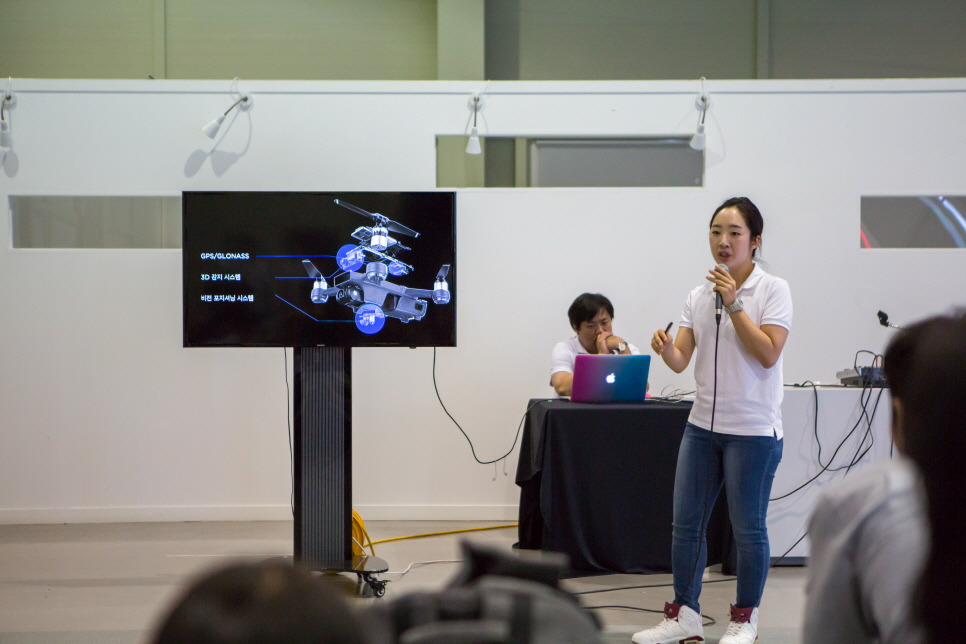 간략하게 제품 관련 PT가 진행되었습니다. DJI 스파크는 1/2.3인치 CMOS 센서가 탑재되어 1080p 영상 및 12MP의 사진을 담을 수 있습니다. 사진 또는 영상 촬영시에는 2축 기계식 짐벌 및 울트라 스무스 기술을 통해 흔들림 없는 촬영이 가능하며 카메라는 25mm 환산 초점거리를 가진 f2.6 광각렌즈가 탑재되었습니다.