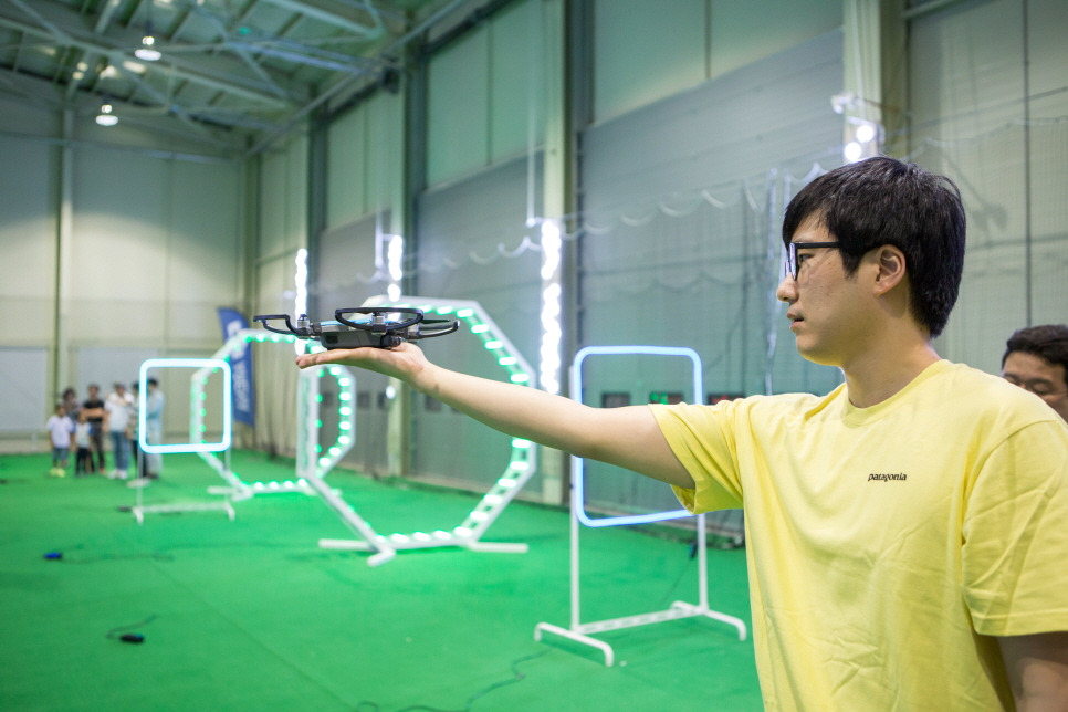 자! 그럼 드론을 날려보겠습니다. 시연장에서는 제스처 모드를 통해 드론을 조작하였습니다. 먼저 dji 스파크를 한손으로 잡고 전원이 켜진 상태에서 전원 버튼을 짧게 두번 눌러 줍니다. 이때 카메라가 사용자를 인지하면 삐비~ 소리가 나고 프로펠러가 작동합니다. 이때 스파크는 호버링하며 제자리에 그대로 떠 있지요. 그리고 후에 손바닥을 펴서 인식시켜줍니다.
