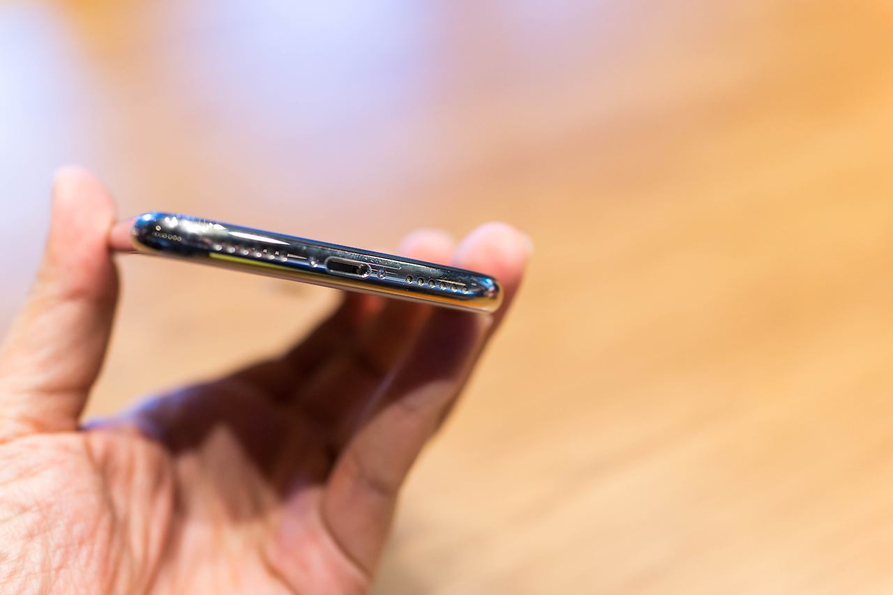 아이폰X 하단의 모습입니다. 이어폰 단자는 없고요. 중앙에 라이트닝 단자 그리고 좌우로 내장마이크가 위치하고 스피커 타공 구멍이 보이는데 사진의 오른쪽은 하단 스테레오 스피커가 맞고 그 옆쪽은 디자인적인 밸런스를 위해 뚫어 놓은 것 같습니다.