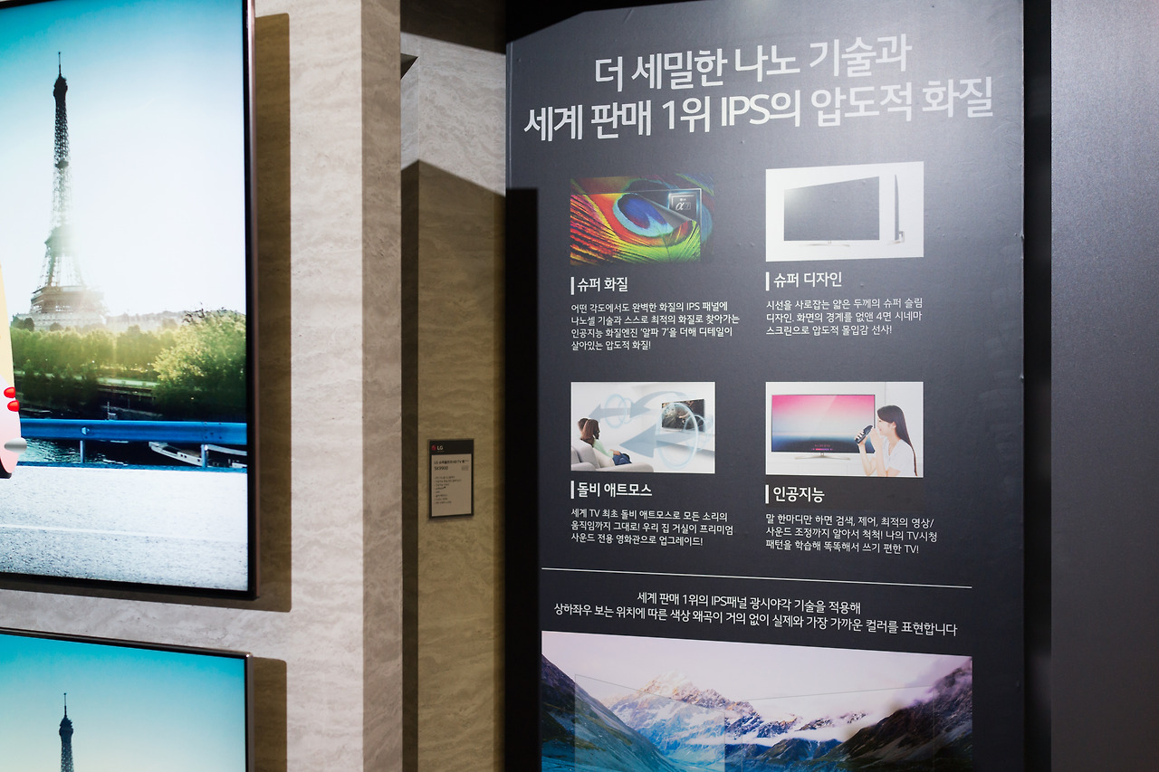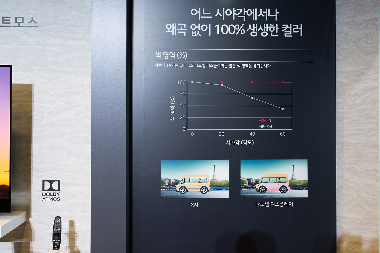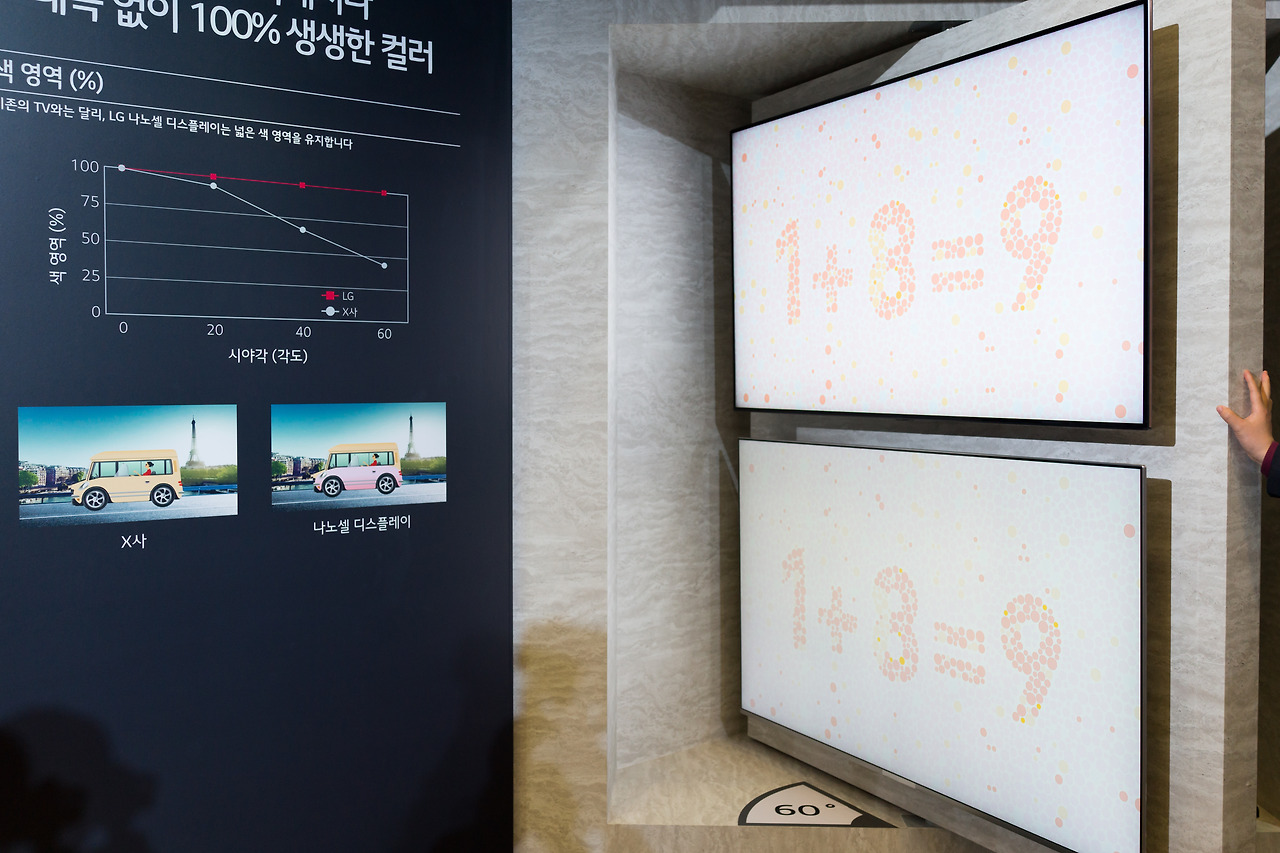 아래 TV는 슈퍼 울트라 HD TV인데요. 패널 위에 극미세 분자를 덧입힌 나노셀 기술의 TV입니다. 이는 색의 파장을 나노셀 단위로 더욱 정교하게 조정해서 보다 많은 색을 한층 정확하게 표현할 수 있습니다. 슈퍼 울트라 HD TV는 사용자가 정면에서 볼 때와 60도 옆에서 볼 때 색상 차이가 없습니다. 그렇기에 거실 어느 곳에서도 정면에서 TV를 보는 것과 같은 화질로 즐길 수 있습니다.