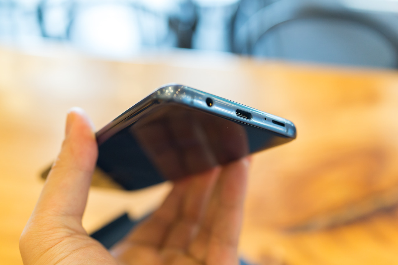 기본 구성품으로 본체 아래쪽에 USB 커넥터, 충전 어댑터, 충전 케이블, 번들 이어폰, 이어팁이 포함되어 있습니다.