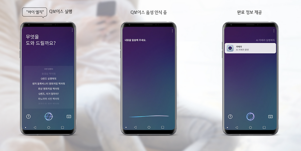 LG전자의 인공지능 비서 Q 보이스가 돌아왔습니다. '하이 엘지' 명령어로 언제든지 Q 보이스를 실행할 수 있고 카메라, 전화, 메시지, 날씨, Q 렌즈 등 다양한 기능들을 명령어만으로 음성 제어할 수 있습니다. 또한 V30에서 사용할 수 있던 기존 구글 어시스턴트 명령어가 23개에서 32개로 더욱 늘어났습니다.