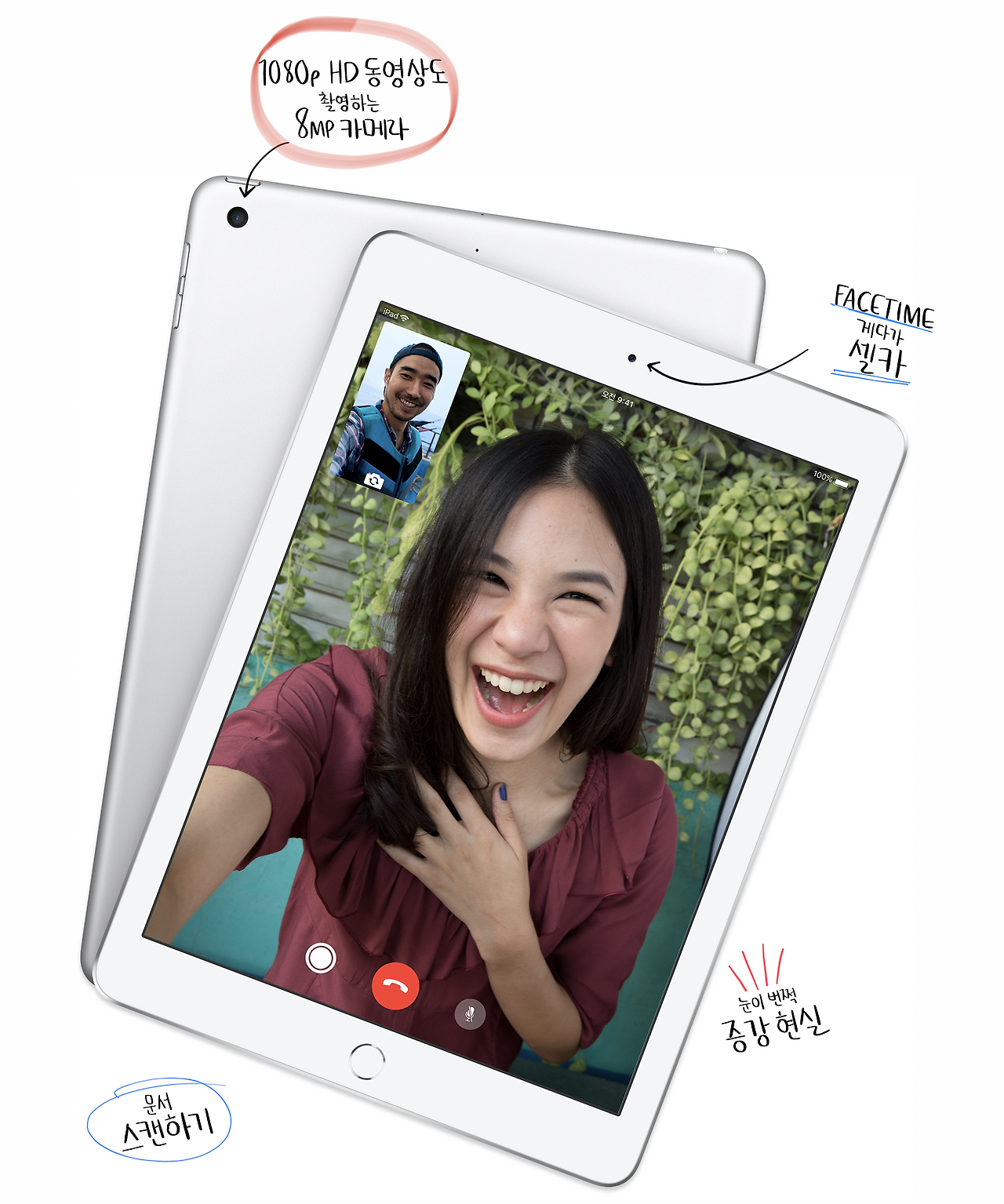 그 외에 신형 아이패드는 풀 HD 동영상 촬영이 가능한 800만 화소의 후면 카메라가 탑재되었고 전면 카메라를 통해 페이스 타임 기능도 활용할 수 있습니다.