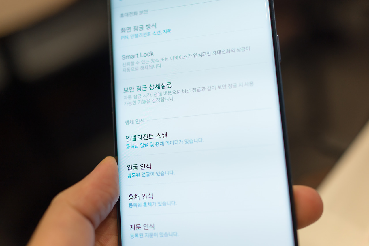 반면 홍채인식은 강력한 보안 그리고 어두운 곳에서도 쉽게 인식이 가능한 반면 센서와 눈의 위치를 잘 맞춰 줘야지 한번에 인식이 된다는 단점이 있었습니다. 그래서 삼성전자에서는 이 둘을 복합적으로 사용할 수 있는 인텔리전스 스캔 기능을 추가했습니다.