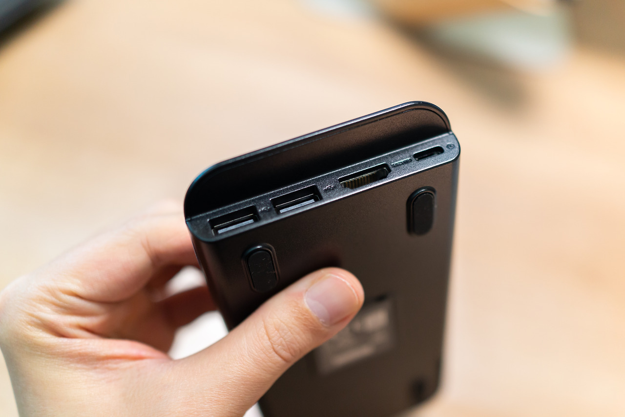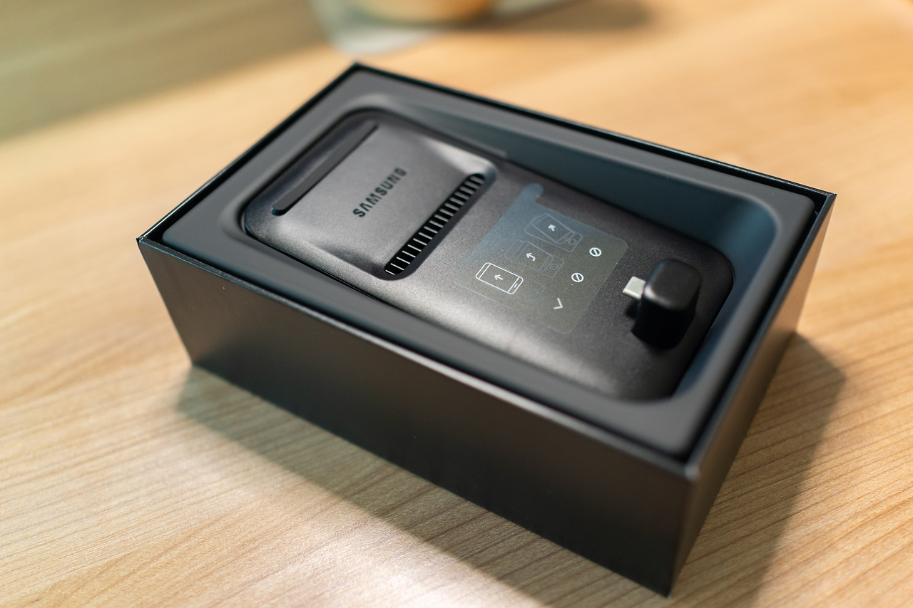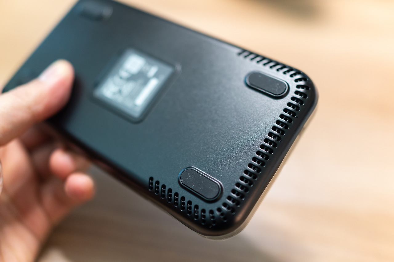 스마트폰 단자에 연결 후 사용하는 제품인지라 제품 위쪽에 USB Type C 포트 및 미끄럼 방지를 위한 고무패드가 보이네요. 덱스패드에는 모니터 또는 TV와 연결 후 사용시 발열을 잡기 위한 쿨링팬이 내장 되어 있고 열 발산을 위한 방열구가 제품 위 아래쪽에 배치되었습니다.