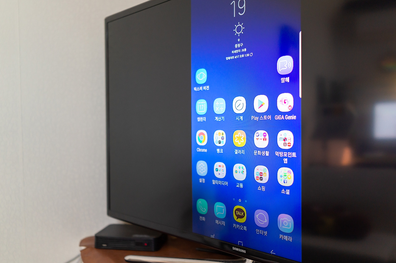 그리고 바로 TV 화면에 스마트폰 화면이 뜨고 갤럭시 S9 플러스 화면은 터치패드 화면으로 바뀝니다.