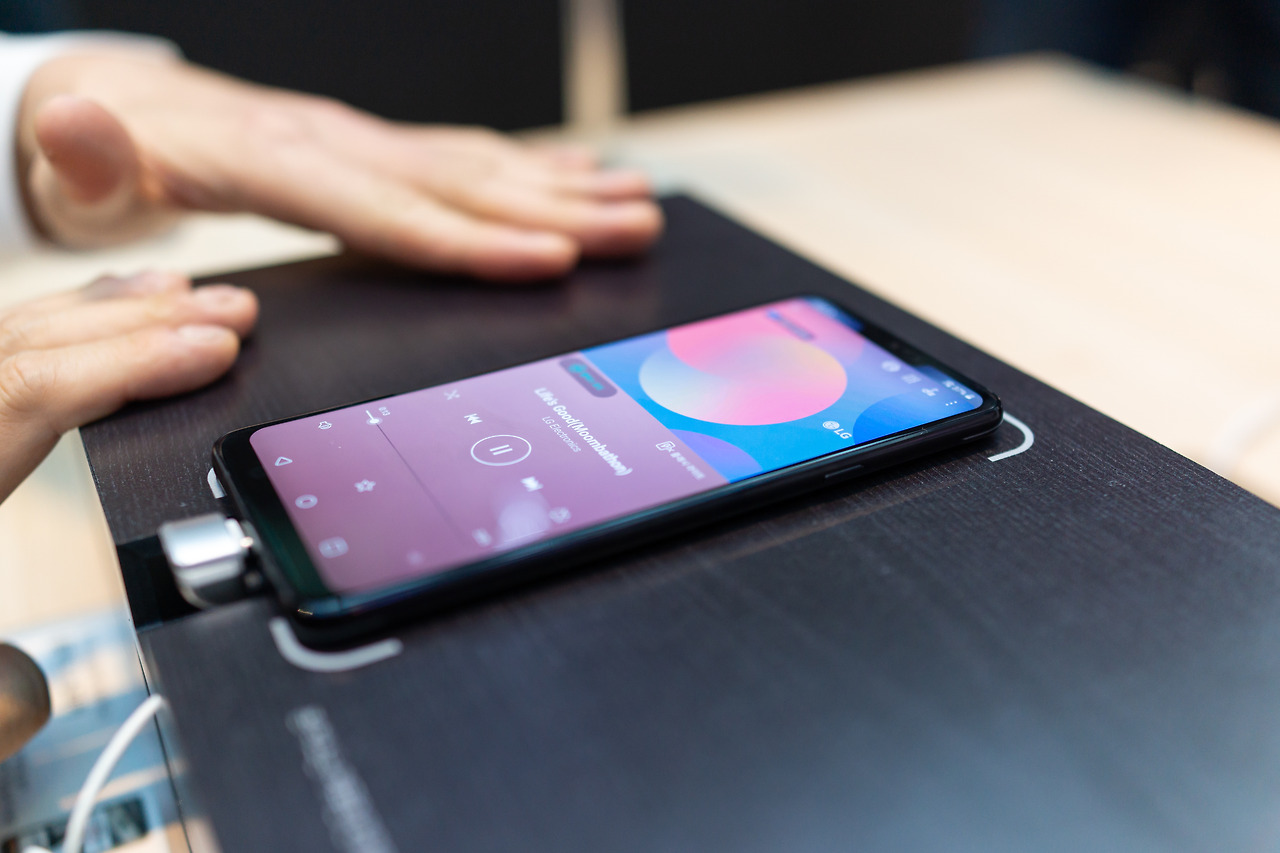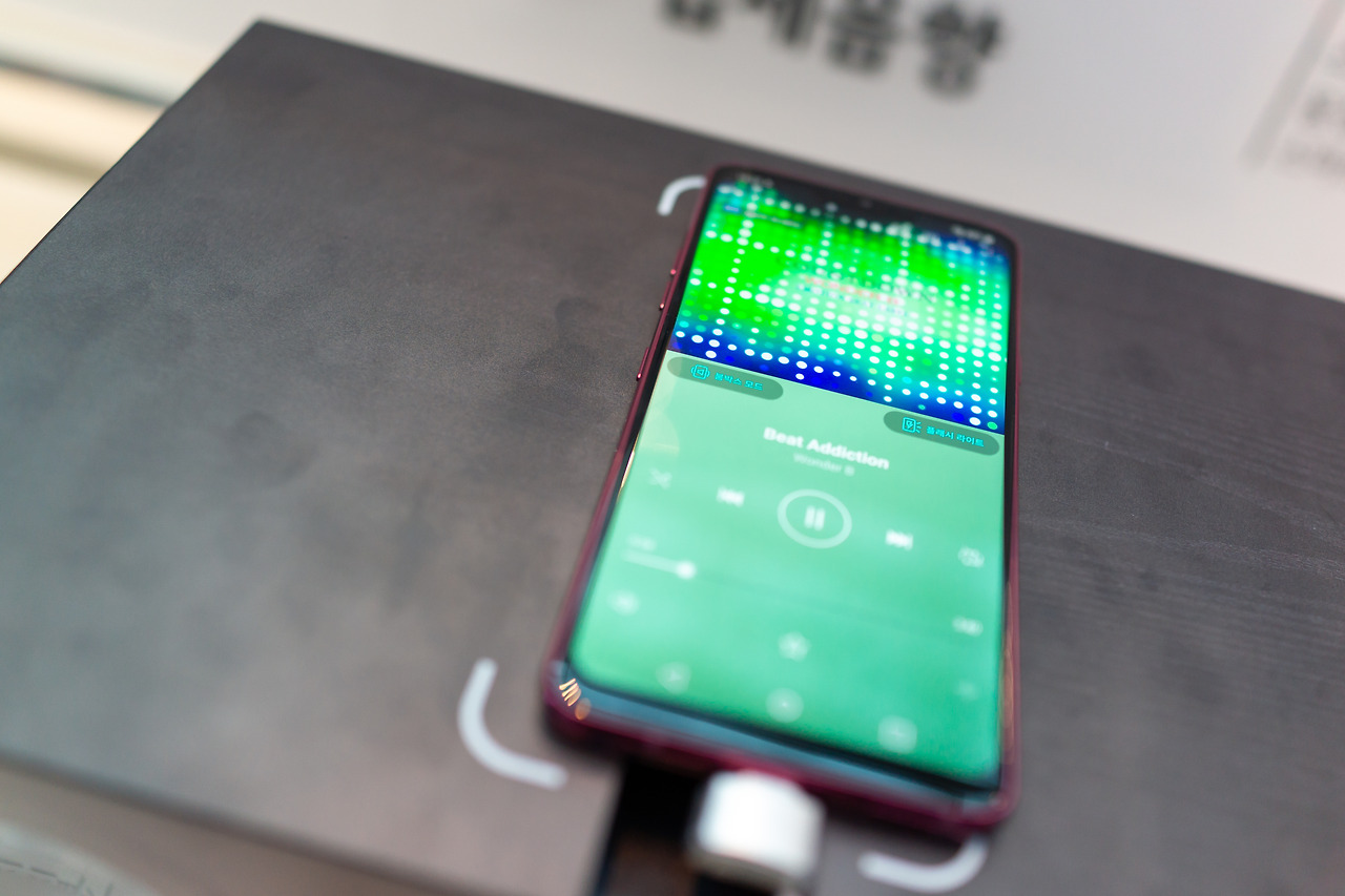기존 제품의 경우 손톱만한 공간을 공명공간으로 사용했었는데요. 이번 LG G7 ThinQ는 폰 전체를 울림통으로 사용하는 신기술의 붐박스 스피커를 탑재하였습니다. 이를 통해 스피커로 음악 또는 동영상 재생 시 테이블과 상자 위에 올려두면 스마트폰 전체가 스피커 역할을 해 일반 스마트폰 대비 출력이 상당히 높아집니다. 또한 음악 비트에 맞춰 스마트폰 플래시 라이트, 비주얼 이펙트, 진동 효과 등의 효과를 사용할 수 있어 붐박스 스피커와 함께 사용할 때에 클럽 분위기를 연출할 수도 있지요.(LG G6 대비 약 10배 이상 커진 울림통)