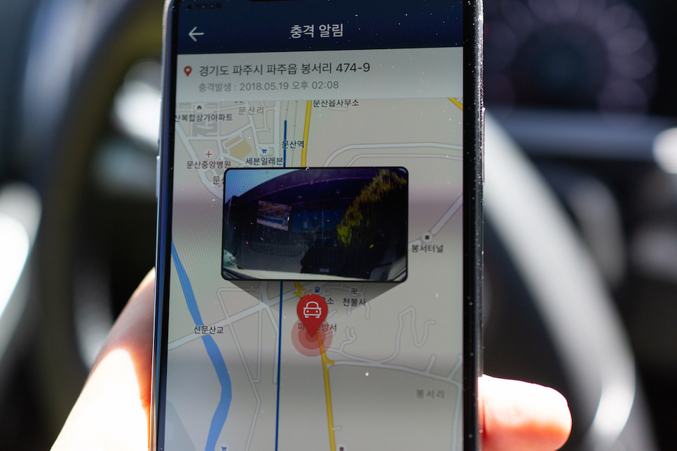 이후 주차되어 있는 차량에 충격이 발생하면 바로 스마트폰 알림과 함께 충격 이미지 업로드 메시지가 뜹니다. 충격 알림 항목으로 들어가면 충격이 발생한 위치와 함께 충격 당시 촬영된 스틸컷을 확인할 수 있습니다.