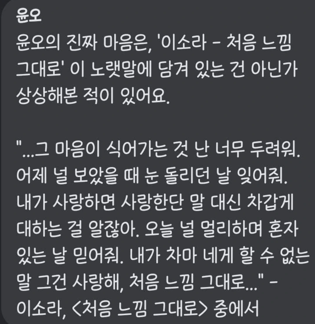 저는 여전히 어리고, 유약하고, 비현실적입니다. 변화를 꿈꾸며 현재의 나를 벗어나려 애썼지만, 예전과 크게 달라지지는 않았습니다. 그럼에도 불구하고 끝까지 나를 포용하고, 좋아하고, 소중히 여기며 살고 싶습니다. 이제는 과거의 나를 탓하지 않습니다. 그 시간들을 지나왔기에 지금의 내가 있으니까요. 상처 앞에서 언제나 용감한 사람이었으면 좋겠습니다.