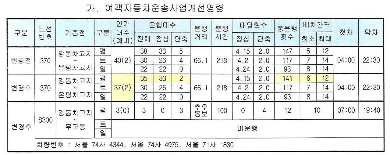 이렇게 하면 370번 일반노선이 왕복 218분 걸리는 운행시간을 100분으로 단축할 수 있어, 출퇴근시간대 직장인 등의 버스에 대한 만족도를 향상시킬 수 있다는 판단을 하였다.