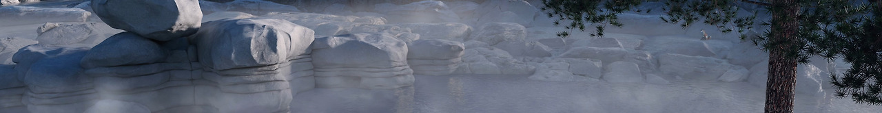 층층이 쌓인 바위와 흐르는 여울물이 어우러진 겨울 풍경입니다.