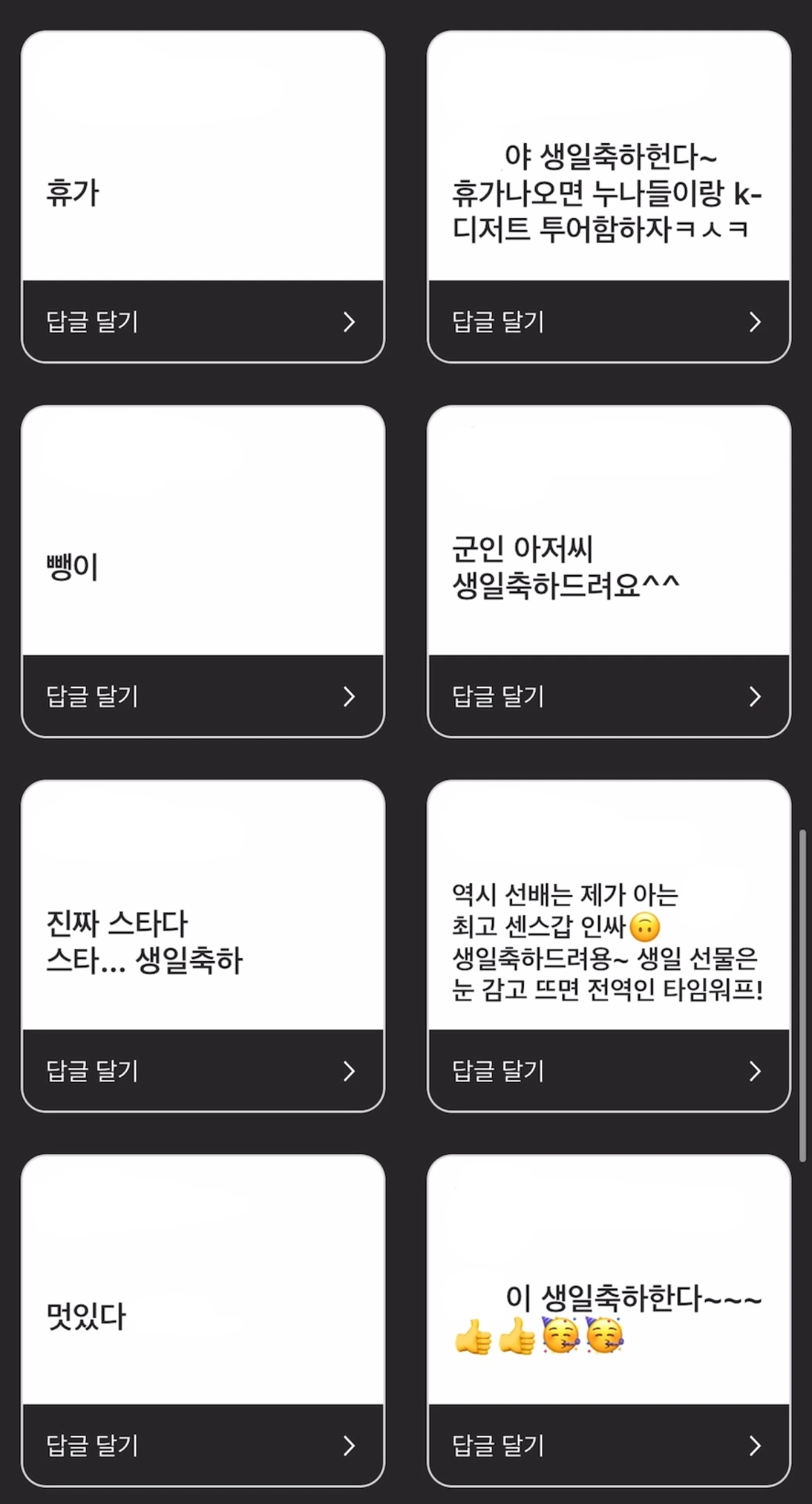 이런 나의 부조화스러운 생각과 행동이 우스울 정도로 지인들은 따뜻한 답장을 보내주었다. 오랫동안 보지 못한 사람들의 생일 축하 메시지도 받을 수 있었고 누군가는 이런 스토리를 올린 나를 센스쟁이라고 칭찬까지 해주었다. 난 행복함을 느끼면서도 한없이 초라해졌다. 군대에 갇힌 후 꾸준히 느꼈던 고독함과 우울함은 나를 자꾸 작아지게 만들었다.