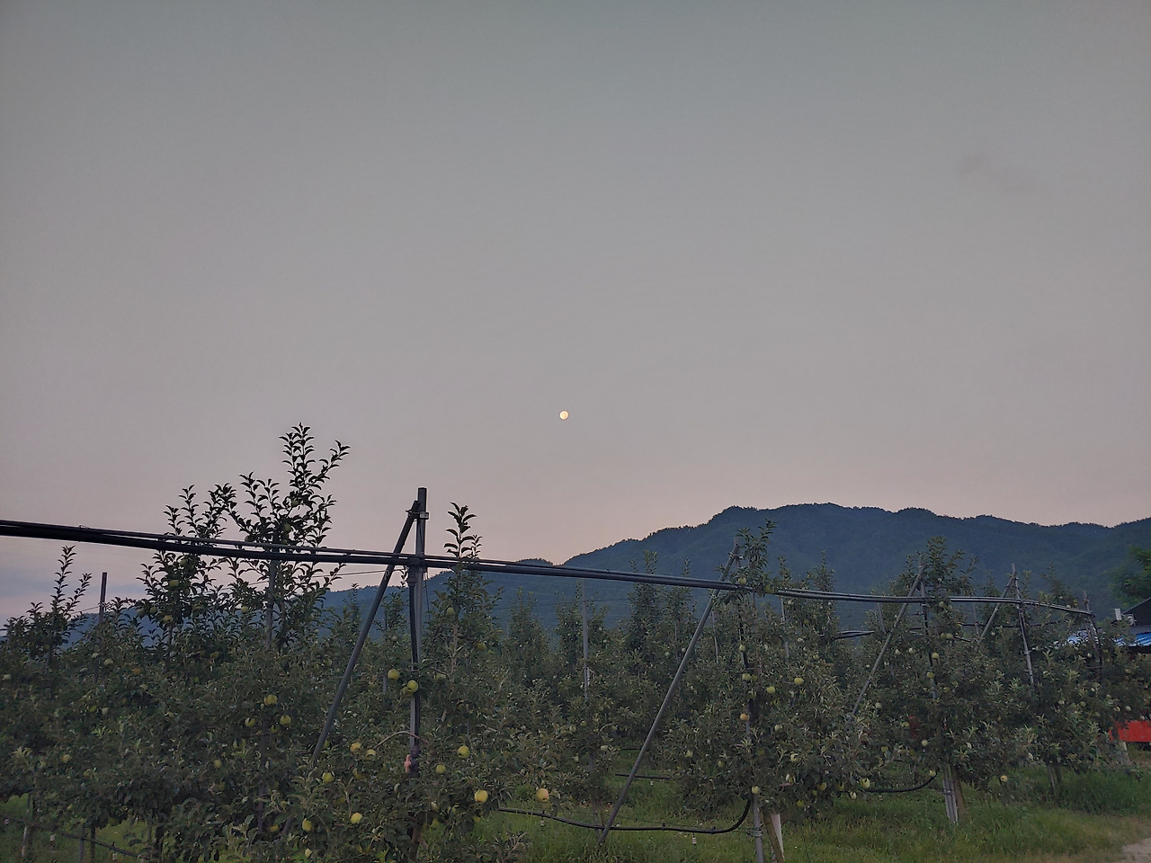 새벽달이 서산에 걸렸습니다. 시간에 살짝 깎여나간 듯 보름달이 조금 이지러졌습니다. 디지털의 시계로는 볼 수 없는 장면입니다.