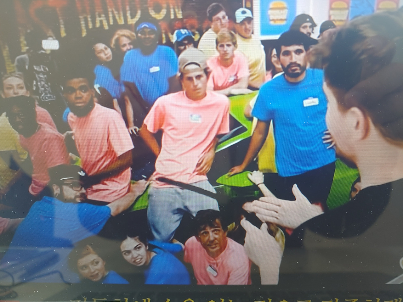 #. 신형 람보르기니 챌린지의 콘텐츠는 기발하다 못해 혀를 내두르게 합니다. 게임은 법칙은 간단합니다. 무작위로 선발된 50명이 신형 람보르기니에 손을 떨어뜨리지 않고, 오래 버티고 있는가가 핵심입니다. 화장실에 가는 경우는 와이퍼를 들고 가면 차에 손을 대고 있는 것으로 인정받게 되죠. 시간이 흐를수록 탈락자들이 생기게 되고, 때로는 참가자들의 허기진 배를 채워주기 위해 피자와 햄버거를 제공합니다. 그런데 여기에도 함정이 있습니다. 먹다가 한 순간이라도 차에서 손을 떼면 금방 탈락입니다. 50개의 모니터가 설치돼 있으니 그걸 피할 수는 없죠. 시간이 지남에 따라 이번에는 탈락을 유도하는 상품을 내겁니다. 스스로 포기하는 참가자 한 사람한테 6천만 원 상당의 승용차를 주겠다고 유혹하죠. 이내 지원자가 나오고, 그는 현장에서 바로 차를 몰고 사라집니다. 때로는 참가자들에게 지금 포기하면 스포츠카를 주겠다고 제의하기도 합니다. 세 명의 경쟁자가 그 제의를 바로 받아들이고, 바로 승자가 결정됩니다. 승자는 스포츠카를 몰고 현장을 떠납니다. 그밖에 아쉽게 탈락하는 참가자한테는 천만 원이 넘는 현금뭉치를 주기도 하고, 가전제품을 마음대로 골라서 가져가라는 호의도 베풉니다. 결국 최종 생존자에게는 3억 원이 넘는 신형 람보르기니를 차지합니다. 그 자리에서 시동을 걸고 신나게 사라집니다.