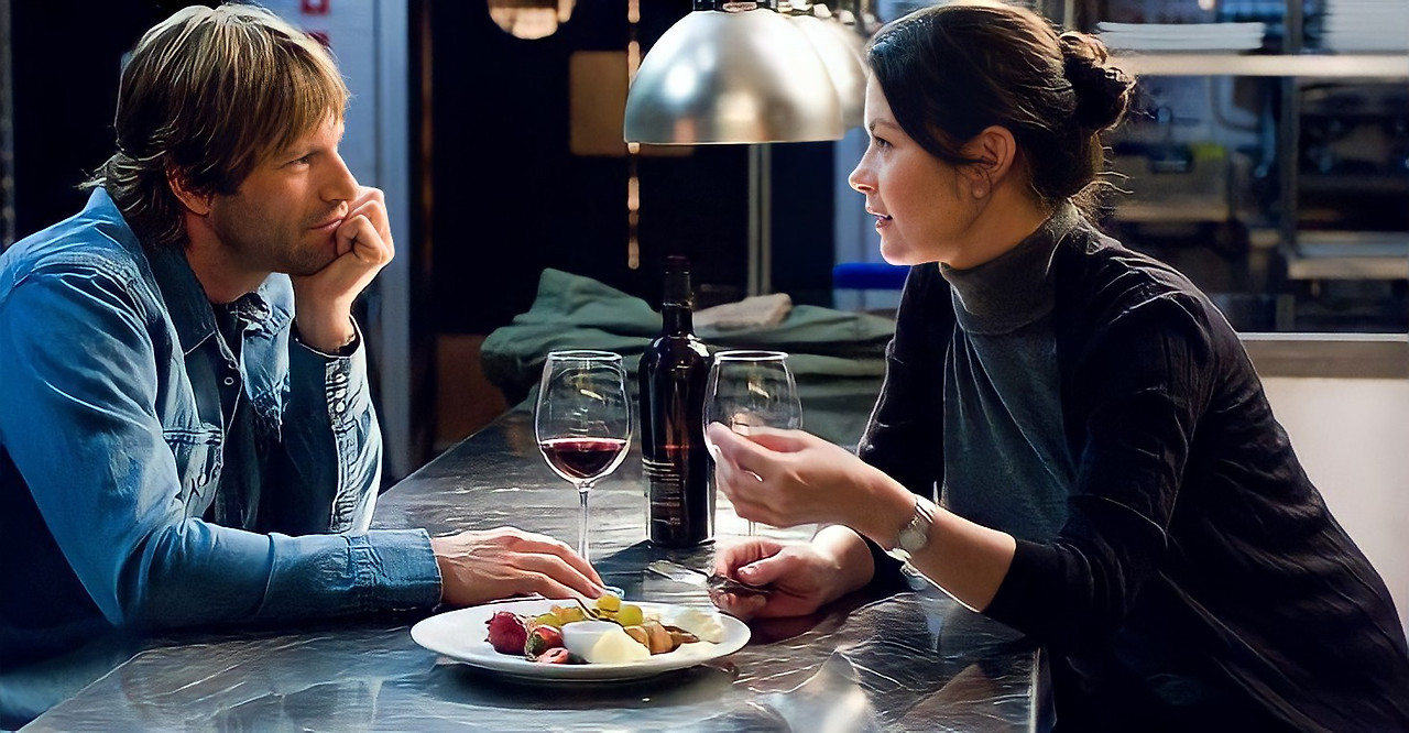 레스토랑 사장의 권유로 상담을 받는 케이트.영화를 하나의 파티에 비유하자면 오프닝 시퀀스는 파티장 입구의 환영단이라 할 수 있다. 게스트를 파티에 확실히 입장시키는 역할을 해야 한다는 뜻이다. 이 영화는 케이트가 상담실에서 음식에 대한 이야기를 하는 것으로 시작한다. 주인공 케이트가 어떤 사람인지에 대한 설명을 관객에게 효과적으로 전달하는 장면. 그 후에도 영화는 케이트의 일터, 케이트의 일상 등을 담은 장면들을 이어나가며 관객으로 하여금 케이트와 가까워지게 한다. 이런 면에서 나는 이 영화의 오프닝이 참 마음에 들었다. 과하지 않으면서도 사람을 영화에 빠져들게 만드는 것이 좋았기 때문에. 개인적으로는 케이트의 원칙적이고 계획적으로 움직이는 성향이 나랑 비슷하다는 느낌을 받기도 해서 더 영화에 집중이 됐다.