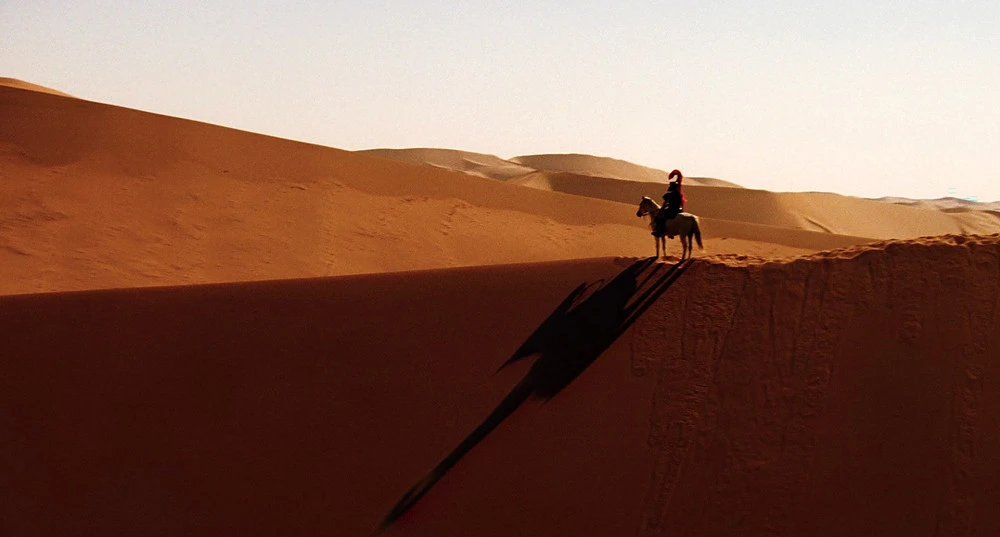 끝없이 펼쳐지는 주황색 사막과 눈이 시릴정도로 파란 하늘의 대비, 그 안의 오브제처럼 놓인 캐릭터.