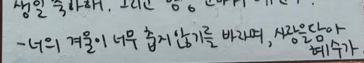 집으로 돌아와 생일을 맞은 이에게 편지를 썼다. 전하고 싶은 말들이 트리와 루돌프가 그려진 엽서 위에 눈처럼 소복이 쌓여갔다. 마지막 줄에는 늘 추신을 덧붙이는 편이다. 여름을 좋아하고 추위를 많이 타는 이에게 겨울의 찬 기운을 조금이나마 덜어줄 문장을 고르고 다듬었다. 눈사람이 그려진 컵이 마음에 들었으면 좋겠다고 생각하며.