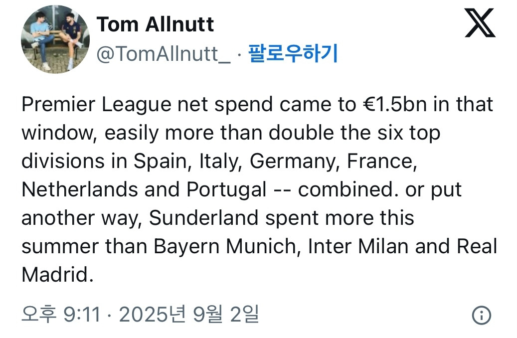 더 타임즈의 기자 톰 알넛의 트윗에 따르면 유럽축구의 중심이라고 할 수 있는 잉글랜드 프리미어리그의 여름 이적시장 넷스펜드 수치(순 지출에서 순 이익을 뺀 값)는 €1.5Bn, 한화로 약 2조 4천억원에 달한다. 이는 라리가(스페인), 분데스리가(독일), 세리에A(이탈리아), 리그앙(프랑스), 에레디비지(네덜란드), 리가 포르투갈(포르투갈)의 넷스펜드 수치를 합친 것보다 2배 이상 높은 수치라고 한다. 그만큼 프리미어리그에는 거대한 규모의 자본이 굴러가고 있다.
