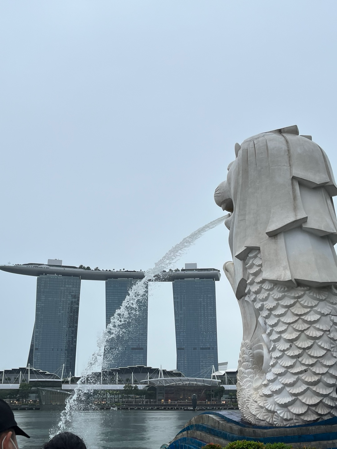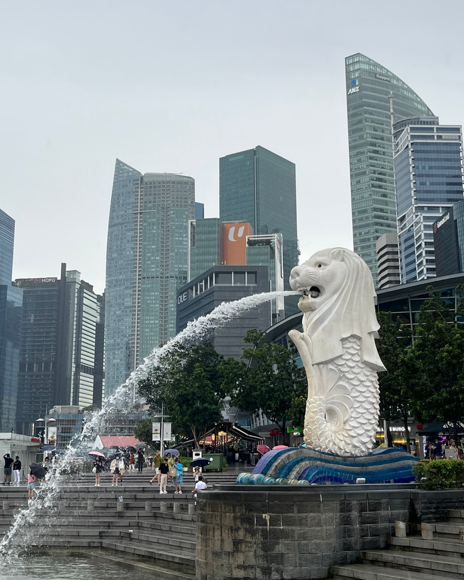 머라이언 공원(Merlion Park)을 향해 열심히 걸었고, 즐비한 건물들 앞에서 시원한 물줄기를 뿜어내는 사자를 발견했습니다.
