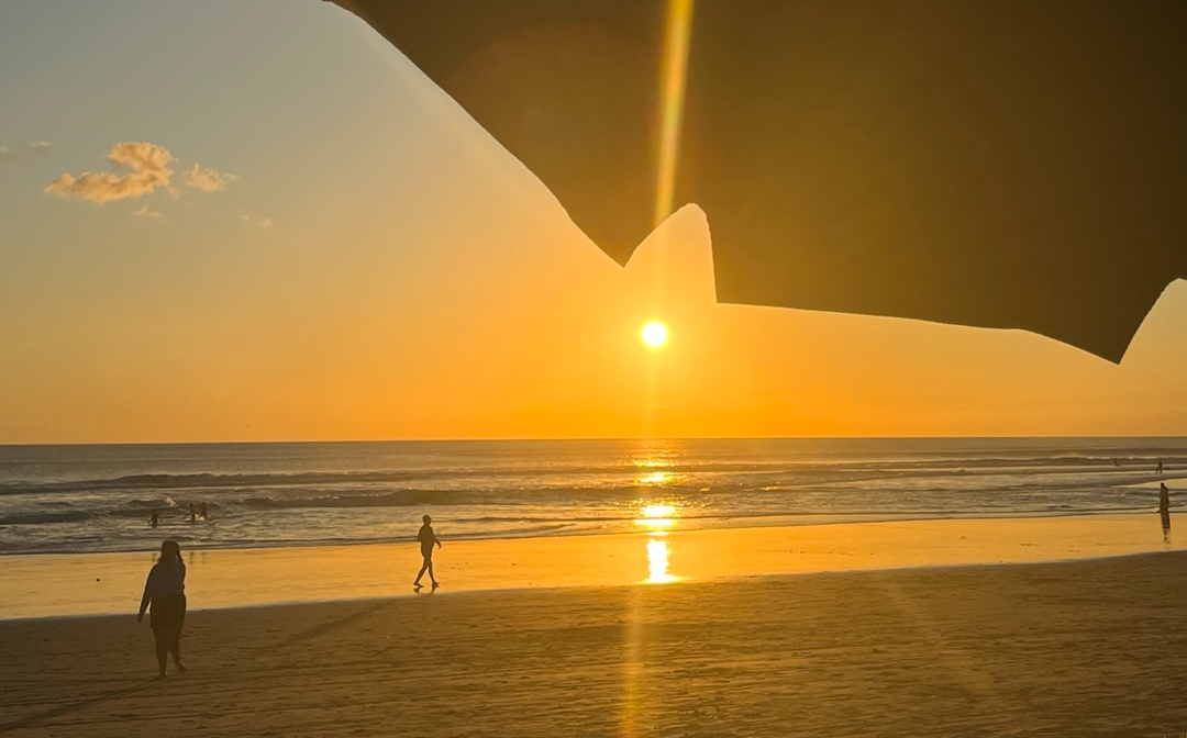 평온한 바다, 부드러운 파도, 짝지어 걷는 사람들과 강아지들, 그리고 익으며 저무는 해.