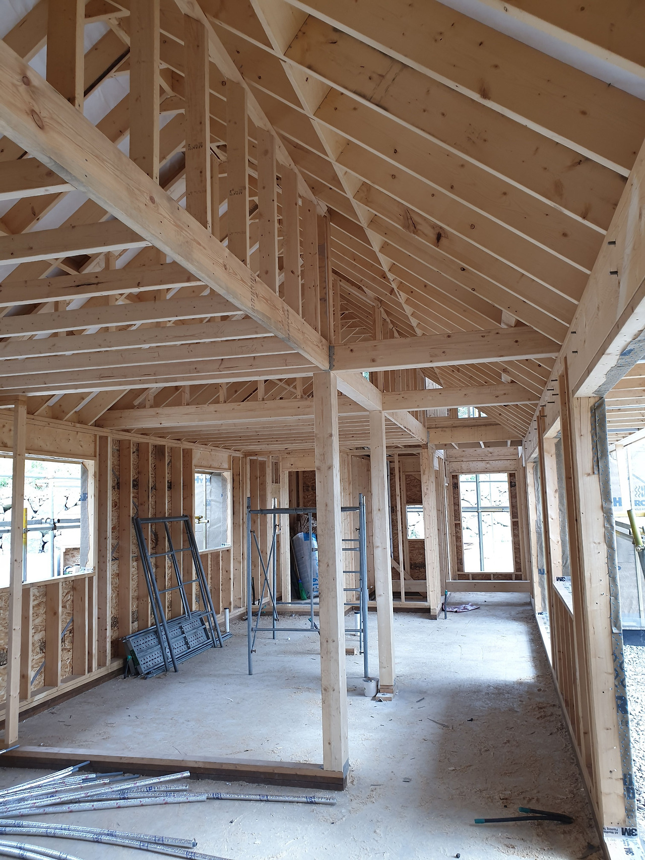 지반조성된 대지에 콘크리트 기초를 하고 구조계산된 목구조를 골조 카펜터들이 시공하게 됩니다. 그 후 실내에서는 전기, 설비, 에어컨 배관공사가 진행되며 단열재, 바닥난방, 인테리어순으로 마감됩니다. 외부는 다양한 외장재(스타코, 사이딩 등)로 벤트 처리 후 시공하며 지붕은 방수처리 후 마감재(슁글, 징크, 기와 등)로 시공하면 됩니다. 향후 데크 및 조경 공사를 진행하여 전체 공정을 마무리되며 해당 관공서에 준공처리하여 입주하게 됩니다.