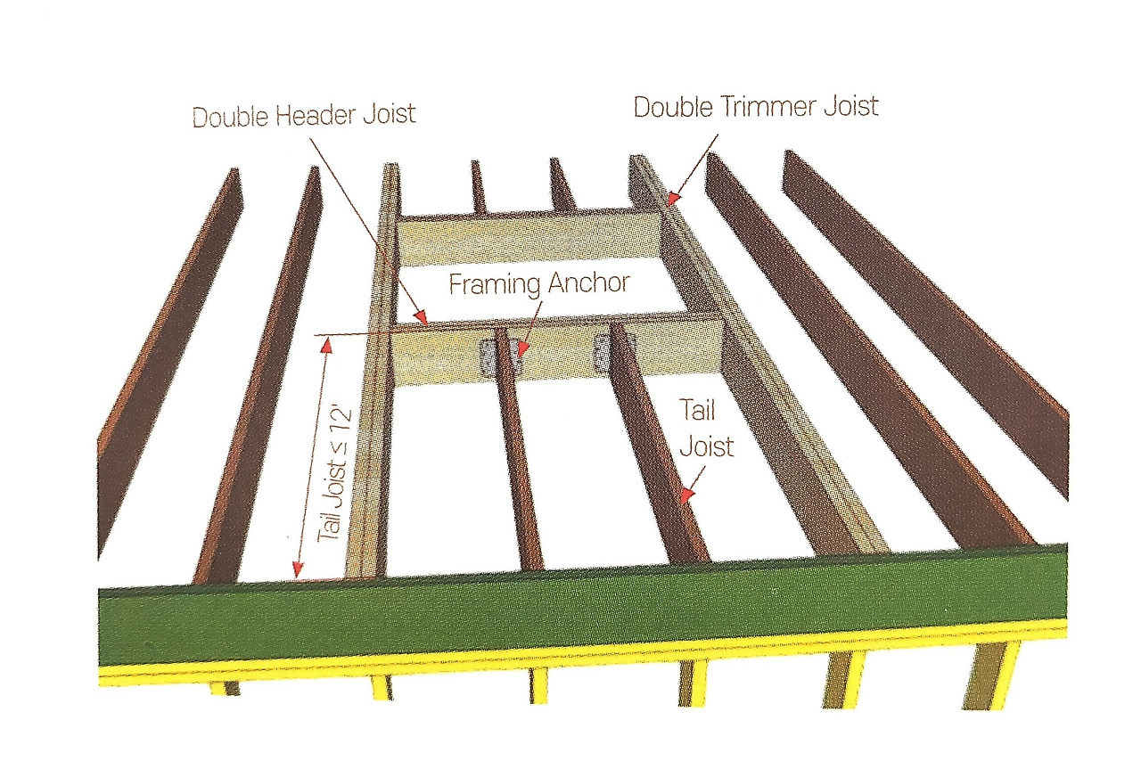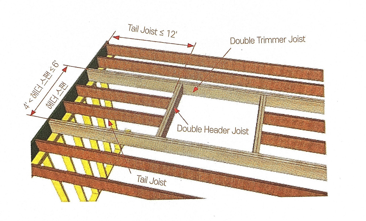 바닥 개구부는 2층으로 올라가기 위해서 계단 윗부분 공간을 말하는데 구조목을 2장 장선을 겹쳐야 되고 벽체에 장선이 걸치지 않는 부분은 행어(철물)를 사용해 보강해야 됩니다. (단, 장선 길이가 1.8m 이하일 때는 못으로 고정 가능)