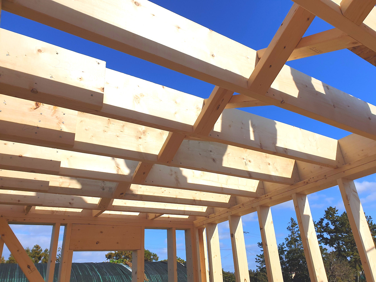 우리나라 같은 경우는 바닥 난방을 하기 때문에 난방관(엑셀관)을 깔고 몰탈을 부어 하중을 증가시키게 됩니다. 장선(joist)을 2층 바닥 부분을 하게 되는데요. 목조 공사에서 하중을 가장 많이 받는 부분이므로 경간거리(벽과 벽사이 거리)를 준수하셔서 시공하고 점검하셔야 됩니다.